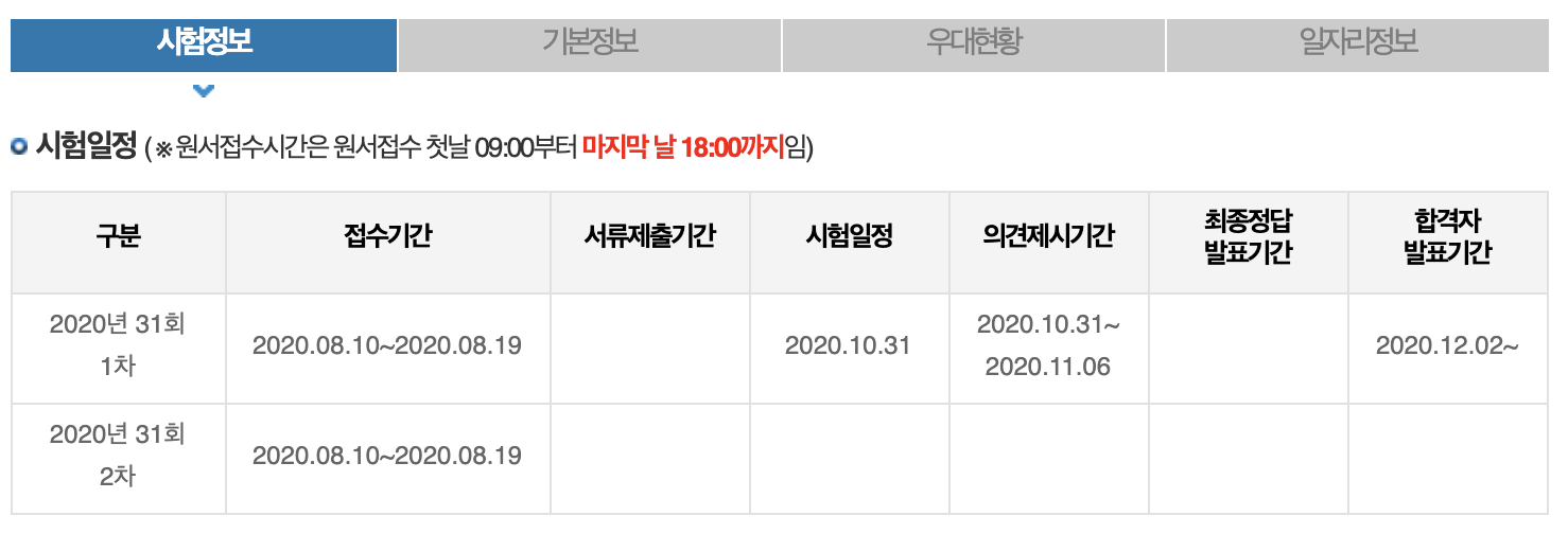 1차 시험과 2차 시험은 같은 날에 시험을 봅니다. 시험은 보통 10월 마지막 주 토요일입니다. 2020년 시험날짜는 10월 31일 입니다. 공부하시는 분들 대부분 1차와 2차를 한꺼번에 준비하는데요. 1차 시험만 합격한 경우에는 2년 동안 2차 시험을 접수할 수 있습니다.