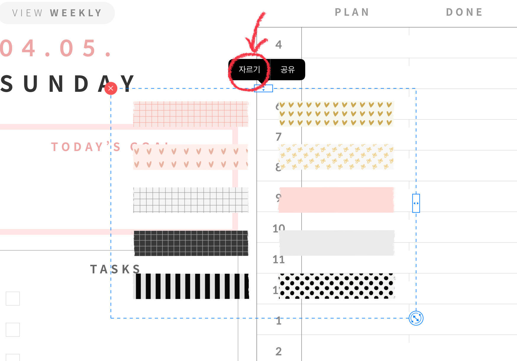 불러온 마스킹 테이프를 펜슬로 한번 터치하면 '자르기' 와 '공유' 메뉴가 나옵니다. 이때 [자르기]를 눌러줍니다.