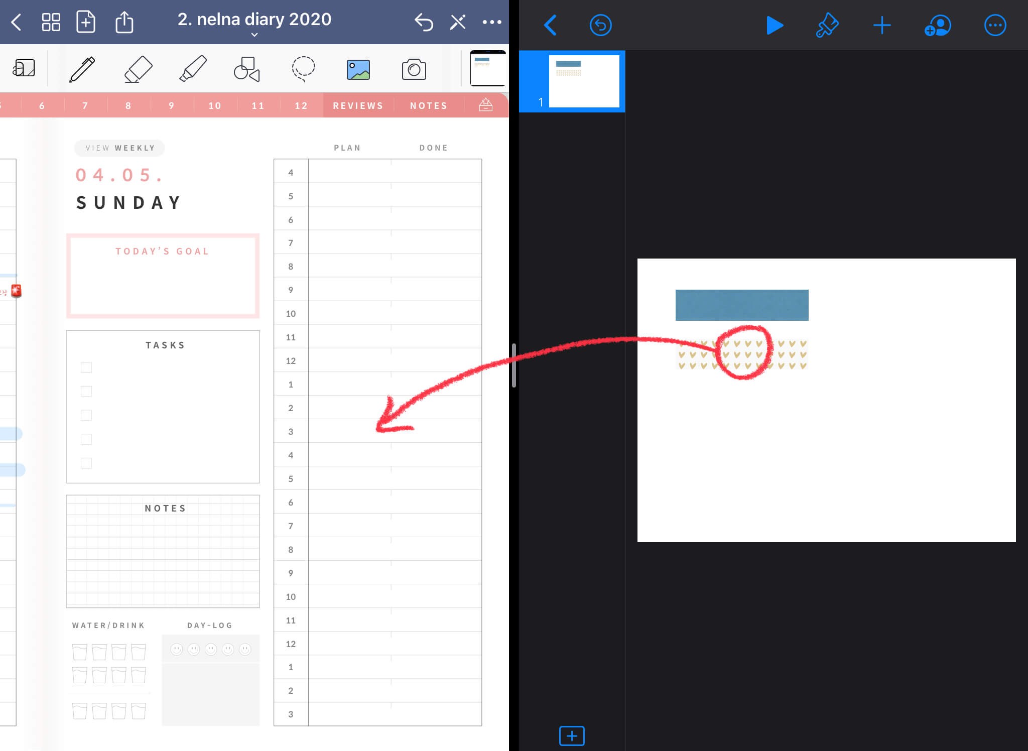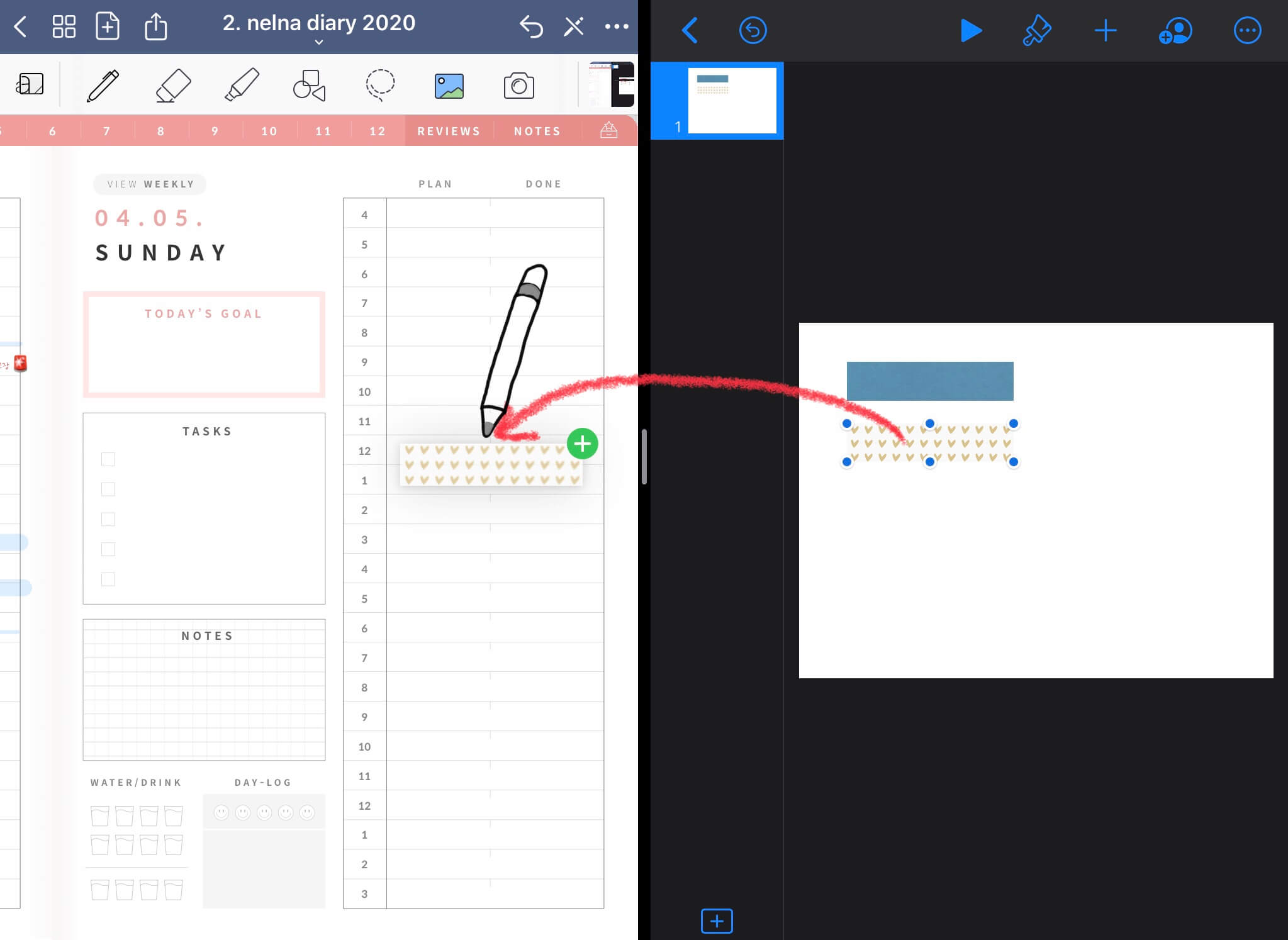 아이패드 화면분할을 이용해서 굿노트와 키노트의 창을 동시에 켜줍니다. 그리고 애플 펜슬을 이용해서 꾸욱 누른 뒤 키 노트로 옮겨줍니다.