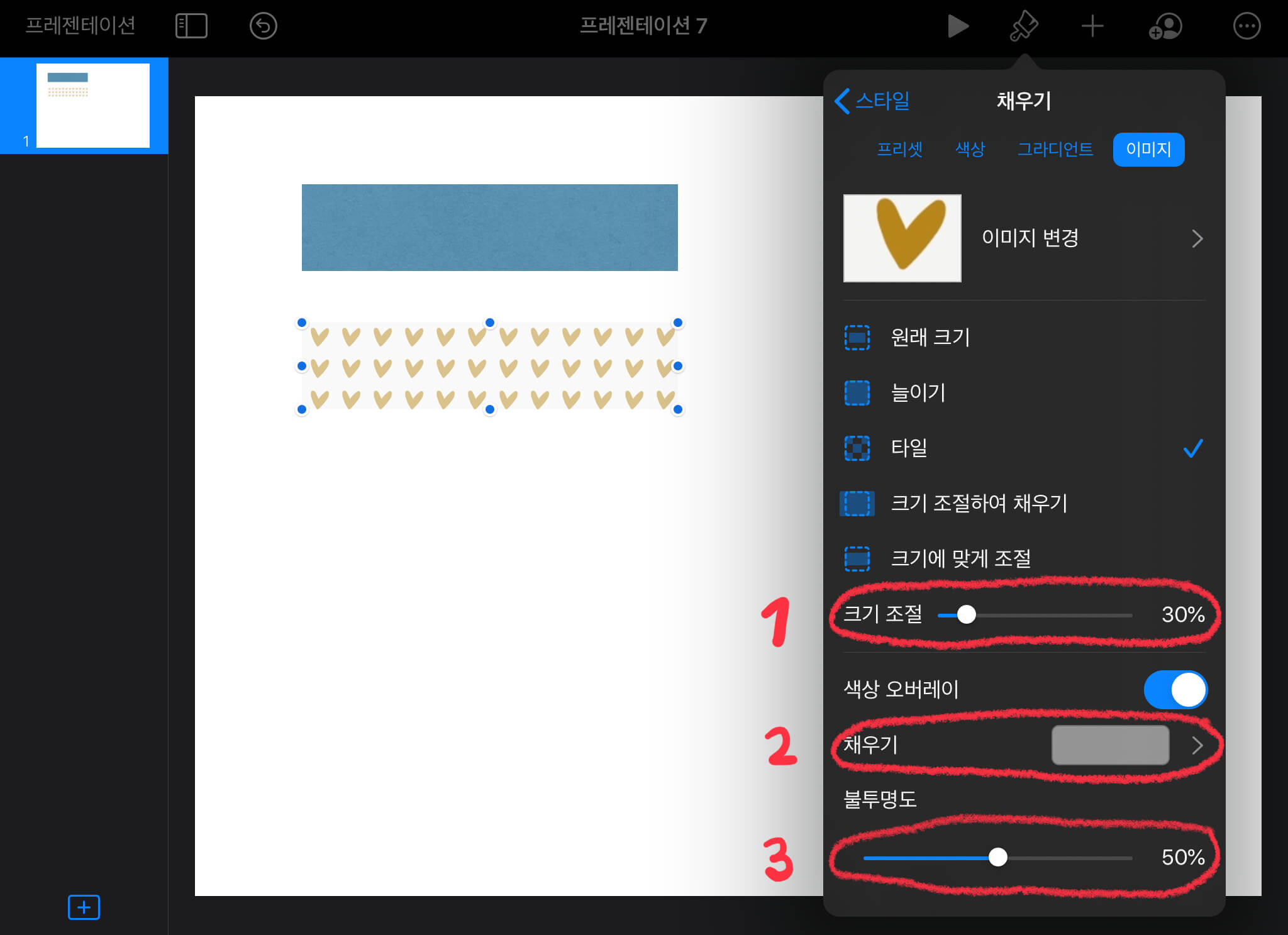 패턴의 크기를 조절하기 위해 아래 [크기조절] 버튼을 좌우로 움직여줍니다. 그리고 [채우기]를 흰색으로 설정해주고, [불투명도]를 50% 정도로 해줍니다.(이때 오버레이를 꺼도 되지만, 자연스러운 느낌을 위해 오버레이와 불투명도를 넣어주는 게 좋습니다.)