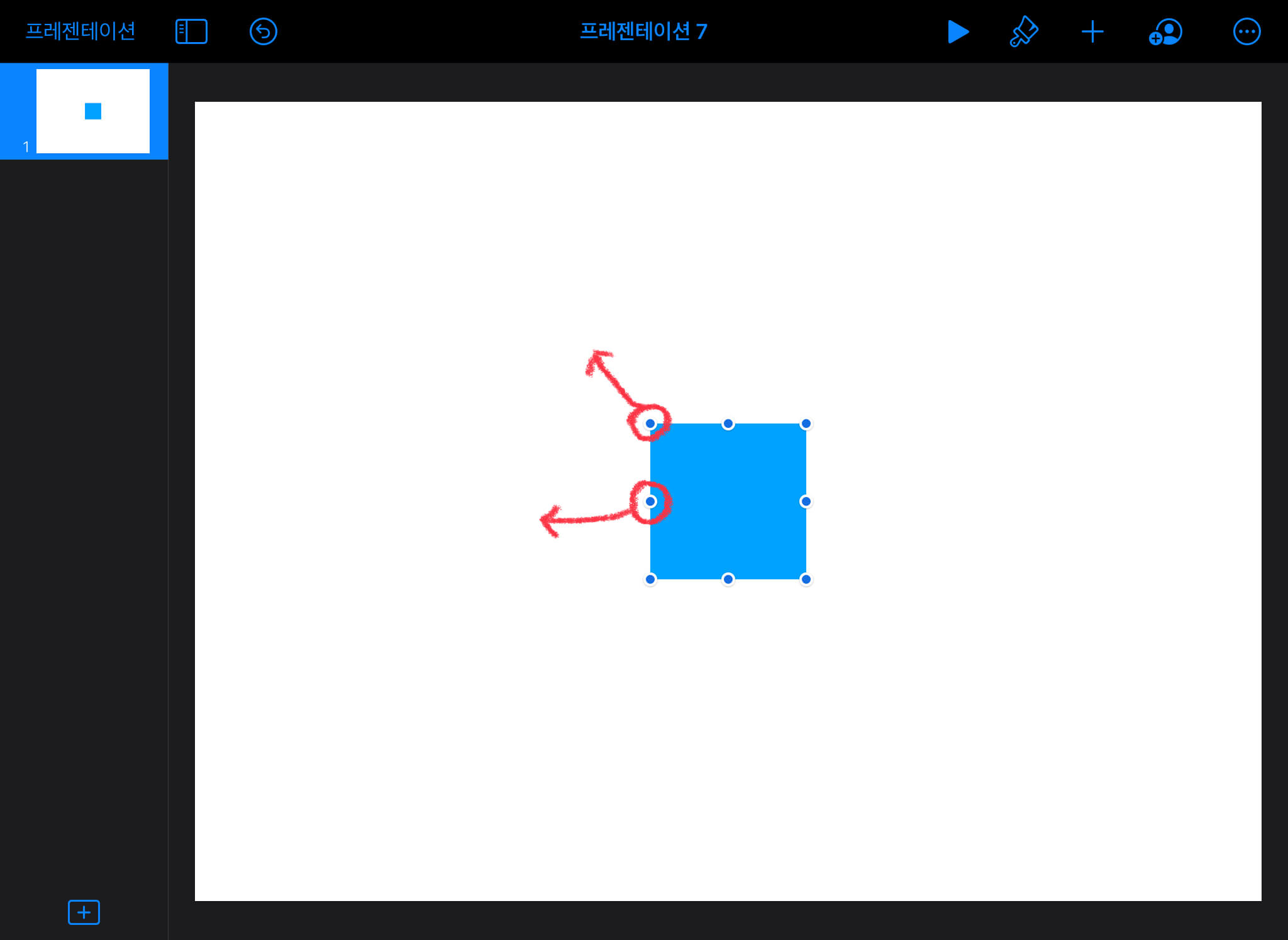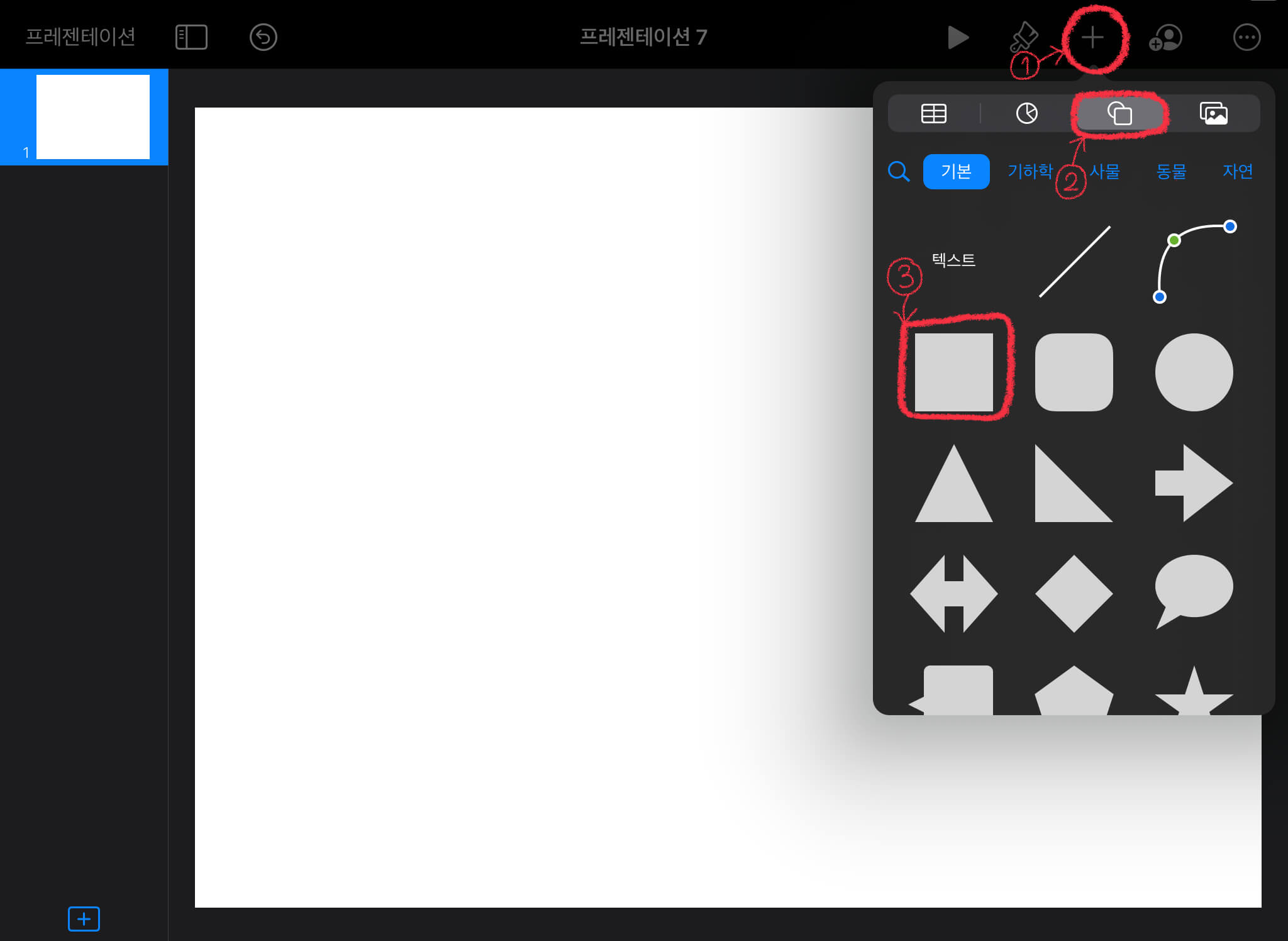 키노트에서 새로운 프레젠테이션을 열어줍니다. 그리고 [+] 버튼을 누르고 [도형] - [사각형]을 누릅니다.