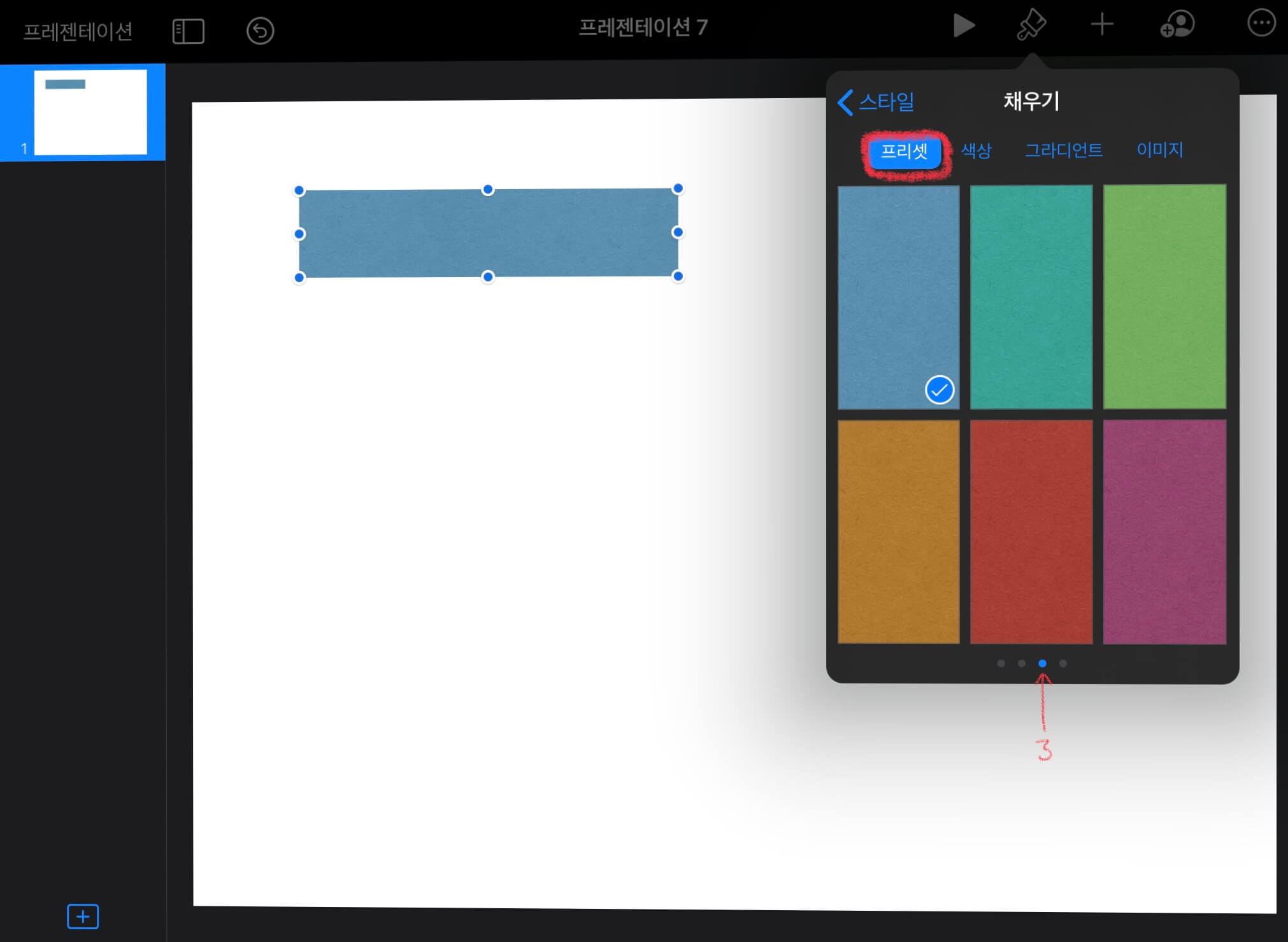원하는 단색을 채워줘도 되고, 아래와 같이 프리셋에 있는 색상을 채워줘도 됩니다. 아래와 같이 톤 다운된 색상은 [프리셋]-[세 번째]에 있습니다.