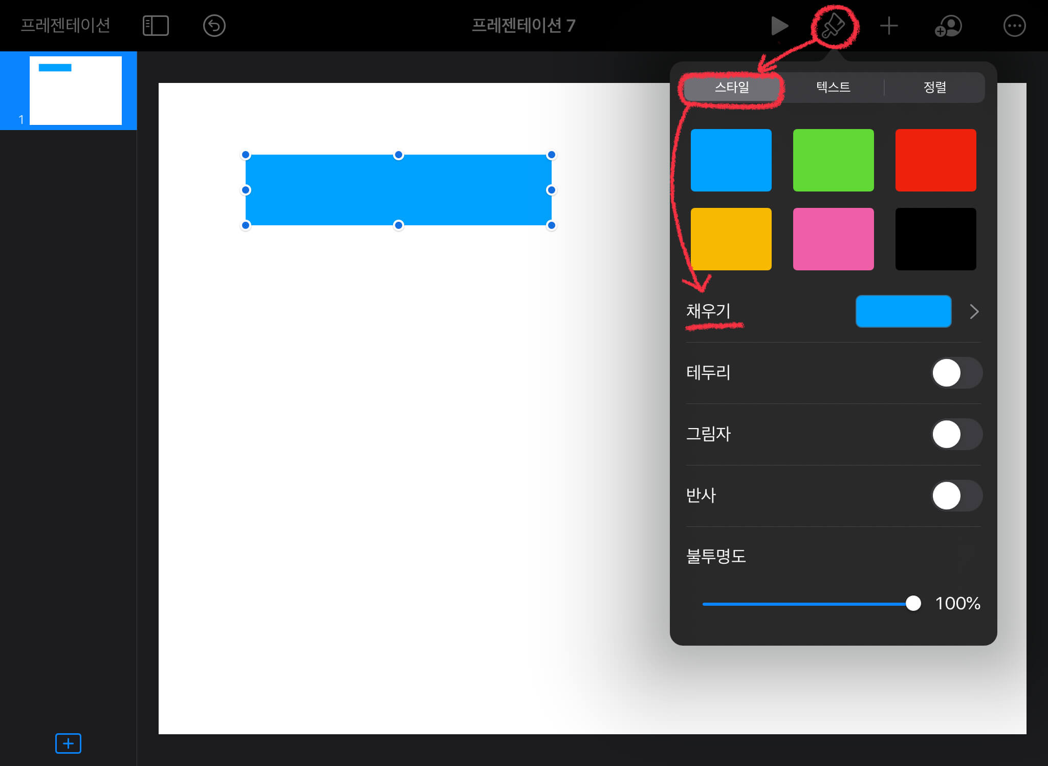 사각형을 선택한 뒤, [붓 아이콘]-[스타일]-[채우기]를 눌러서 마스킹 테이프 색상을 정해줍니다.
