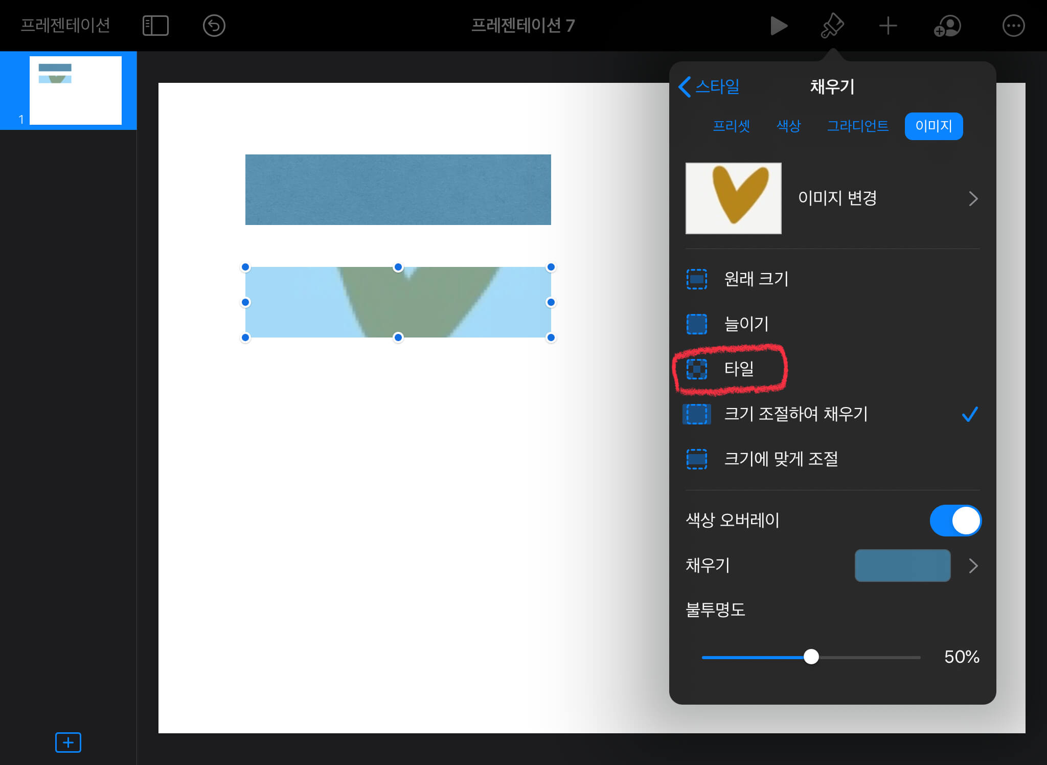 패턴을 만들어주기 위해서는 이미지를 [타일]로 설정을 해줍니다.