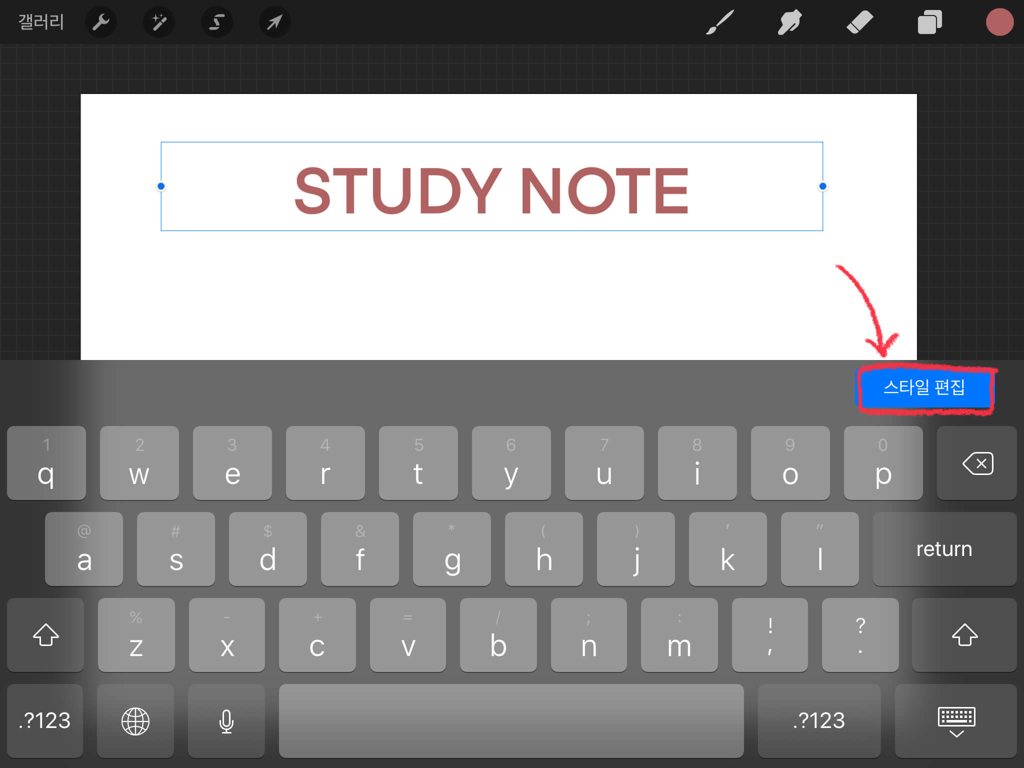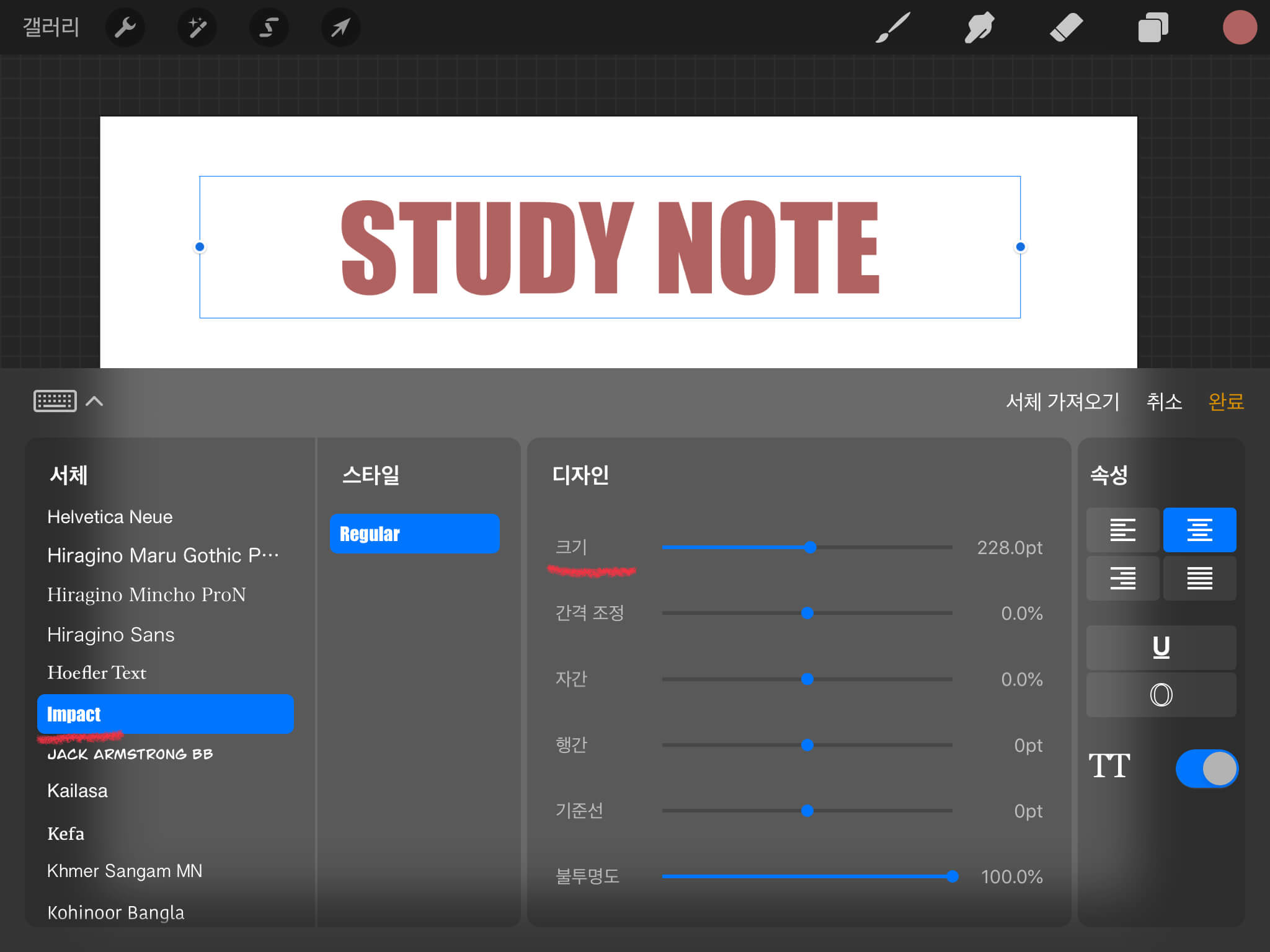 원하는 글자를 텍스트란에 적어주세요. 폰트, 크기, 자간 등을 변경하고 싶을 때에는 [스타일 편집]을 눌러 변경합니다. 저는 Impact체 228pt로 설정해주었습니다.