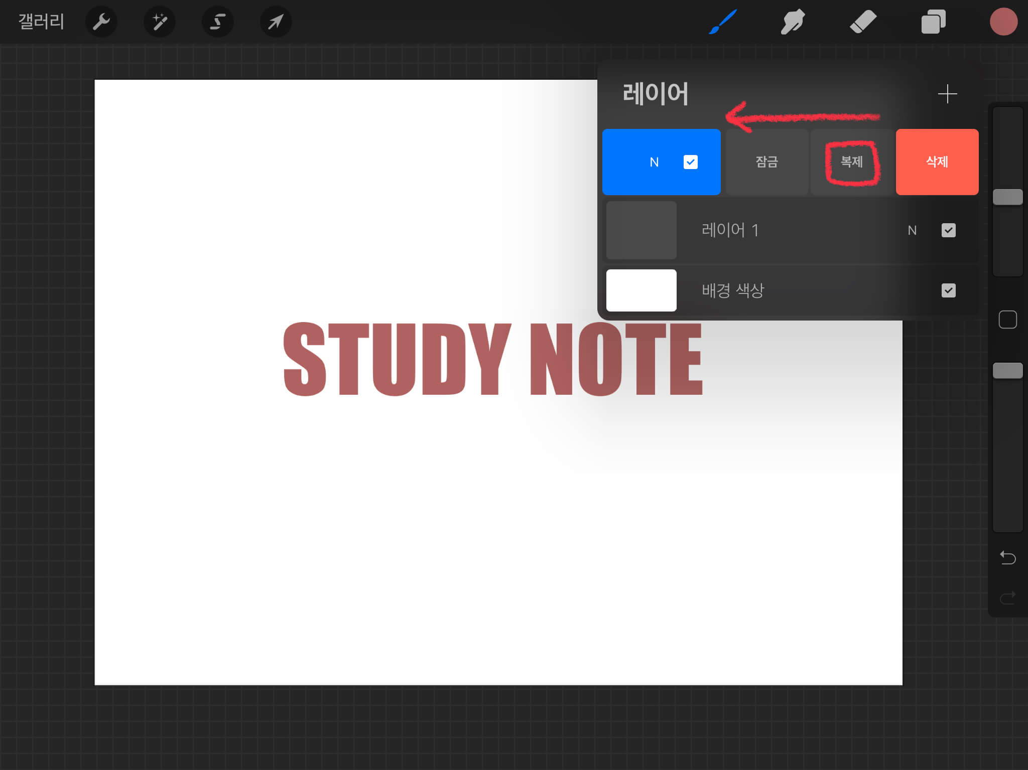 텍스트 레이어를 왼쪽으로 쓸면 [복제] 버튼이 나옵니다.