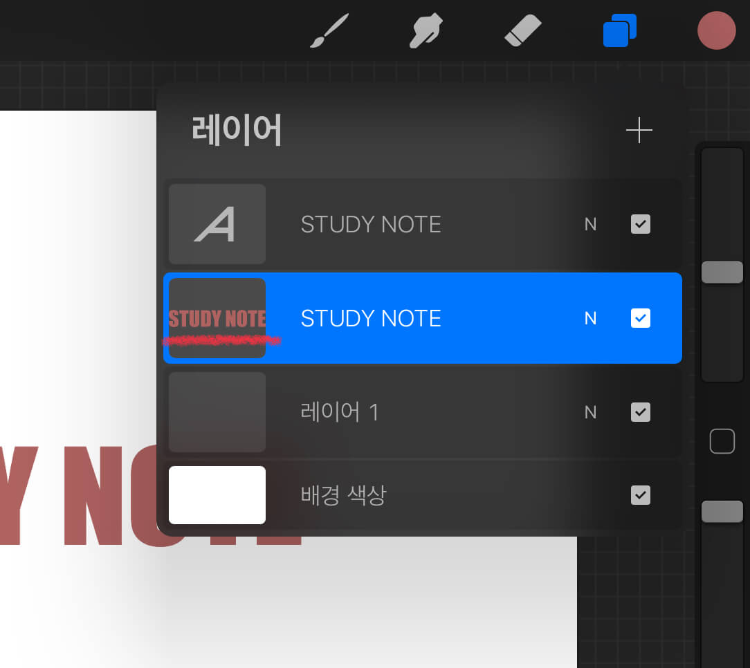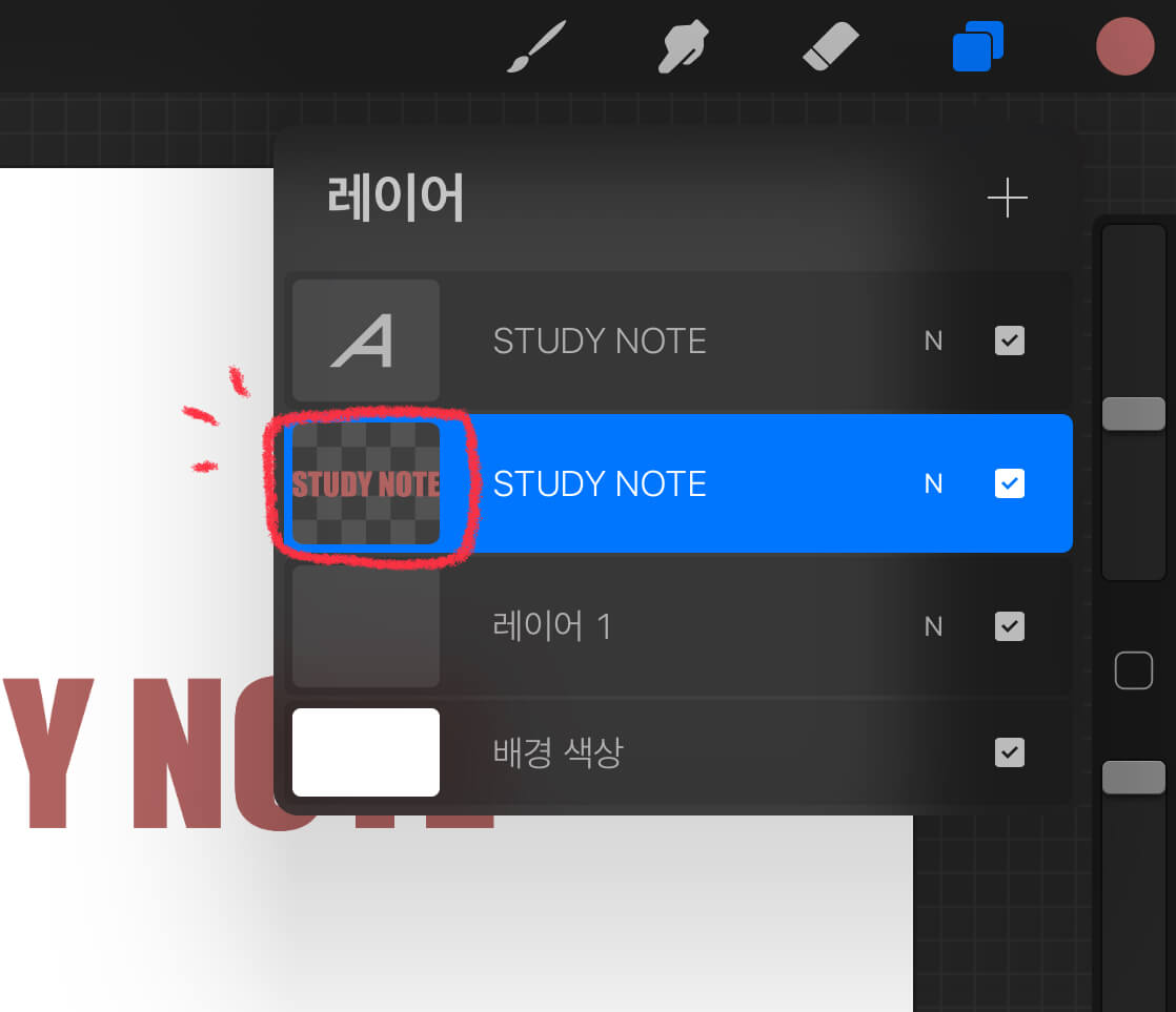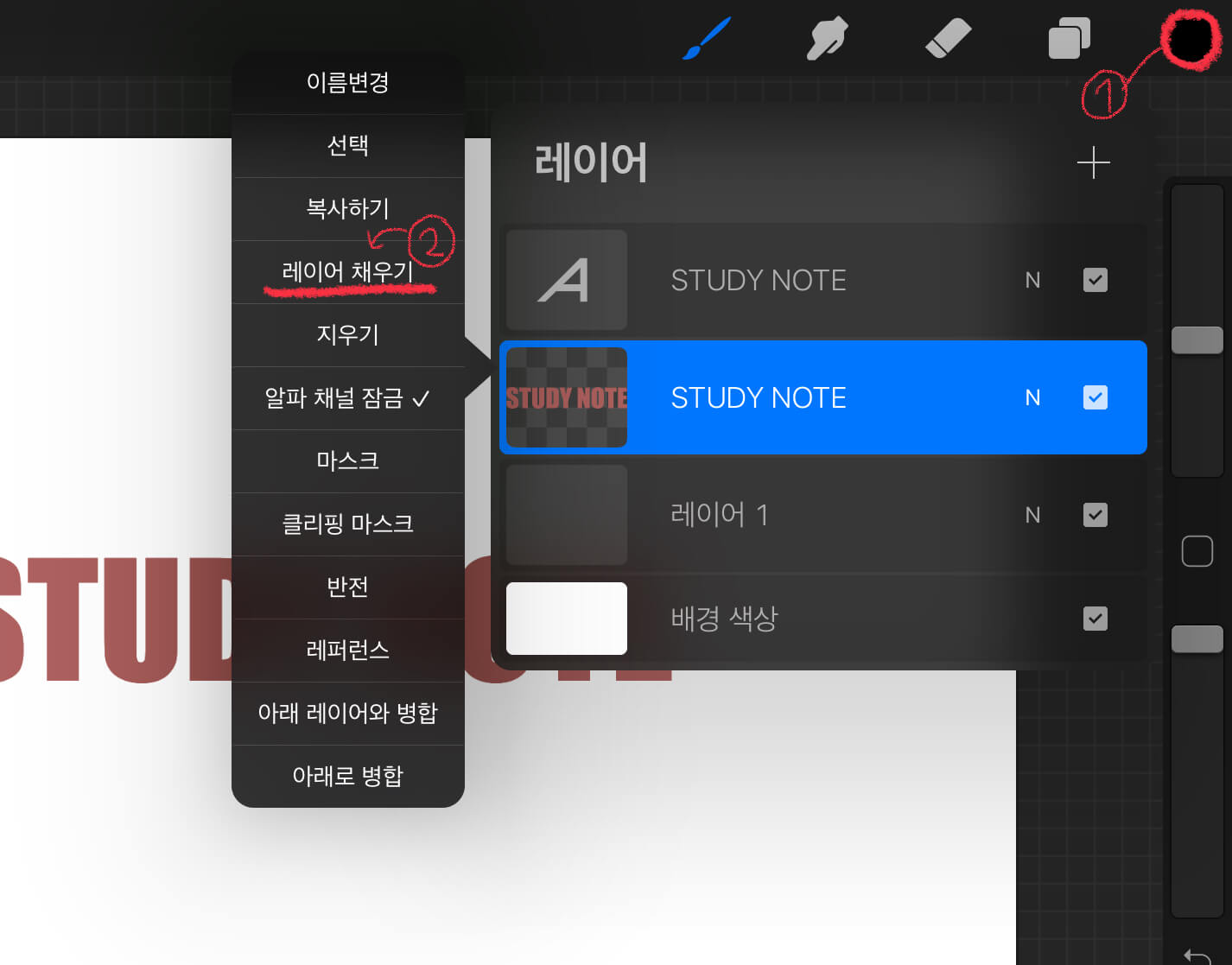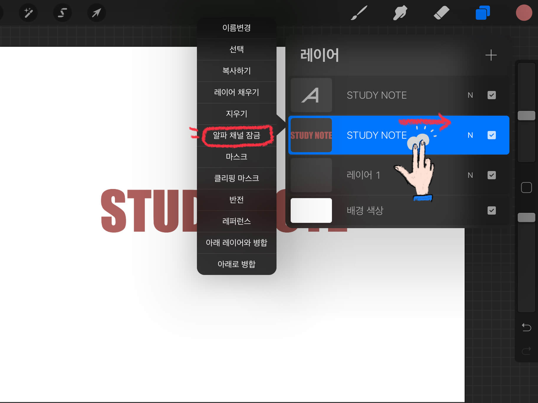 Tip - 두 손가락을 레이어에 대고 오른쪽으로 쓸면 똑같이 알파 채널 잠금이 적용됩니다