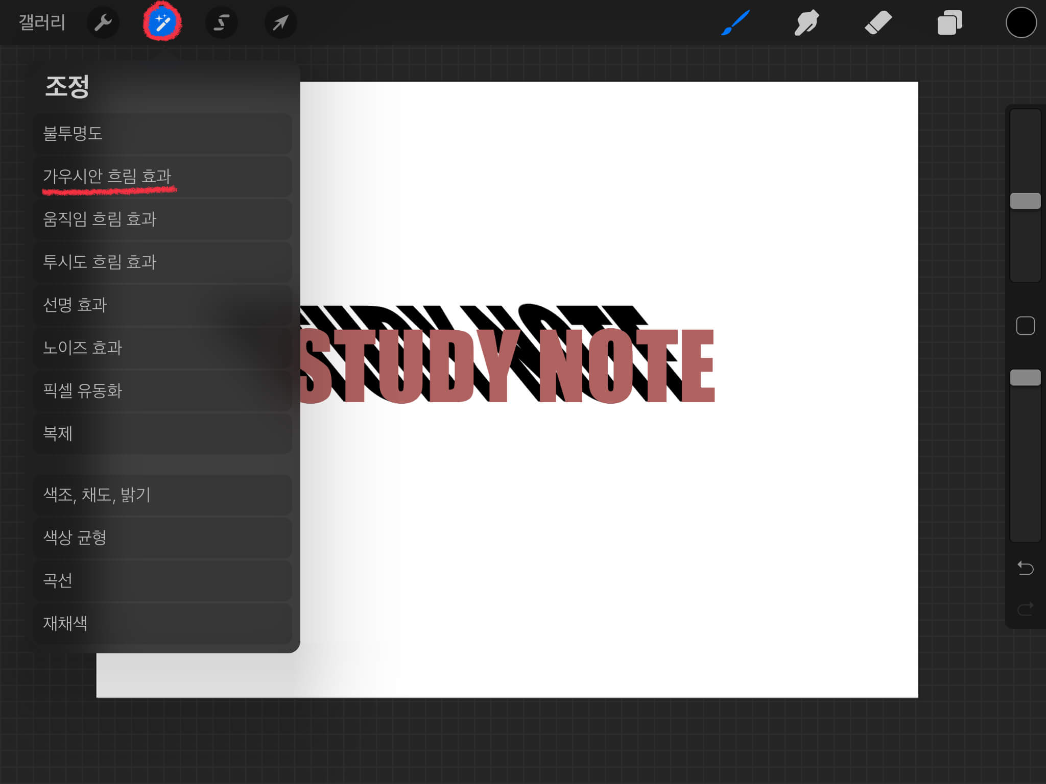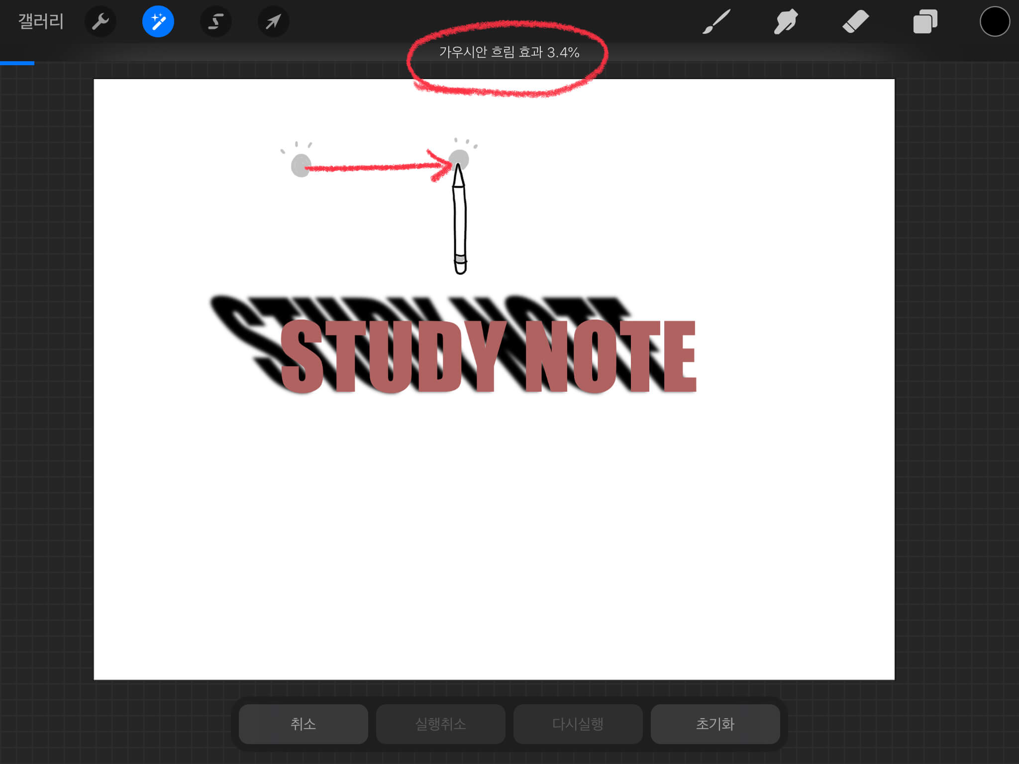 애플 펜슬을 화면에 대고 오른쪽으로 죽 그어주면 흐림 효과 정도를 조절할 수 있습니다. 흐림 효과를 3% 정도로 만들어 줍니다.