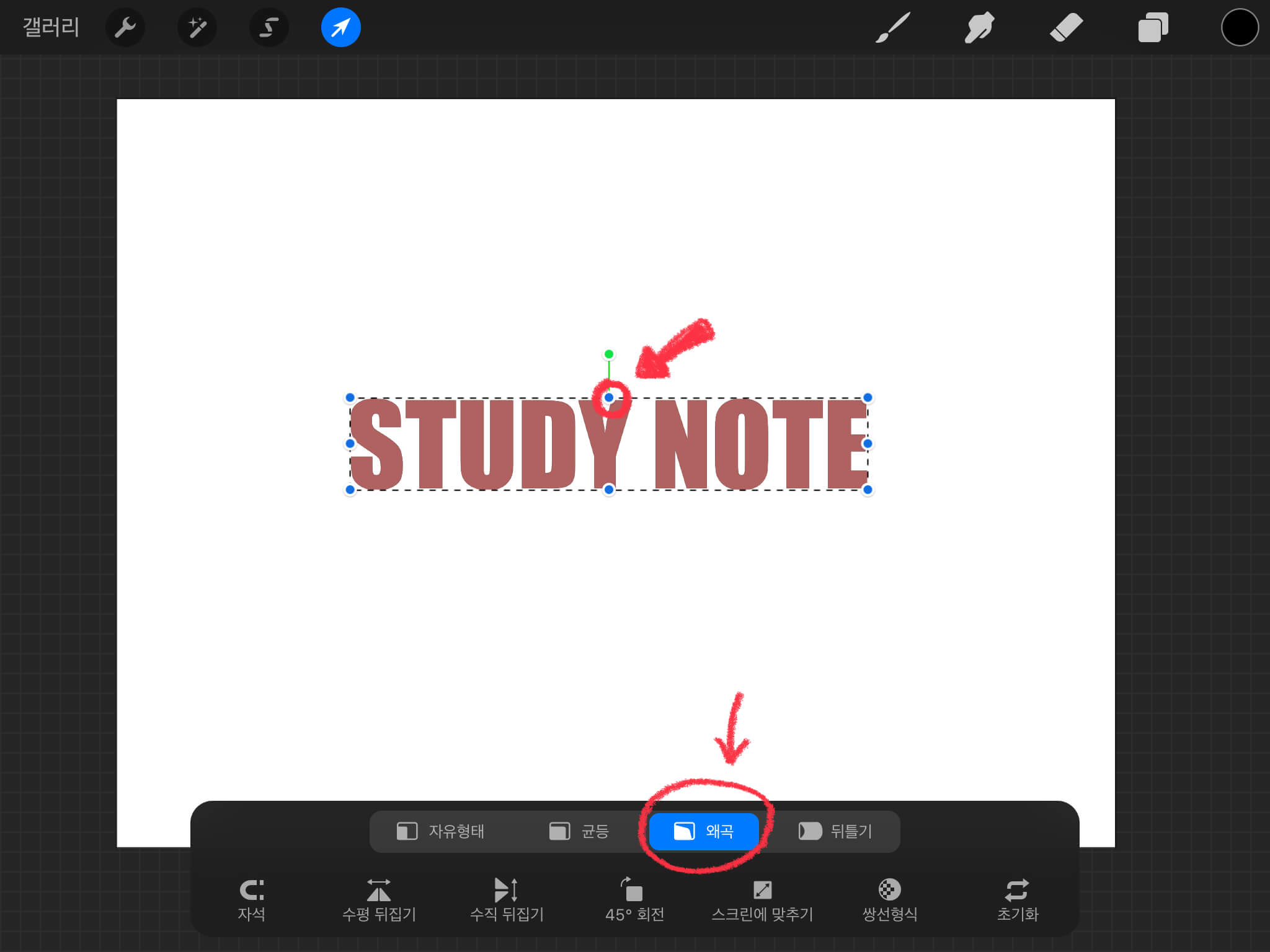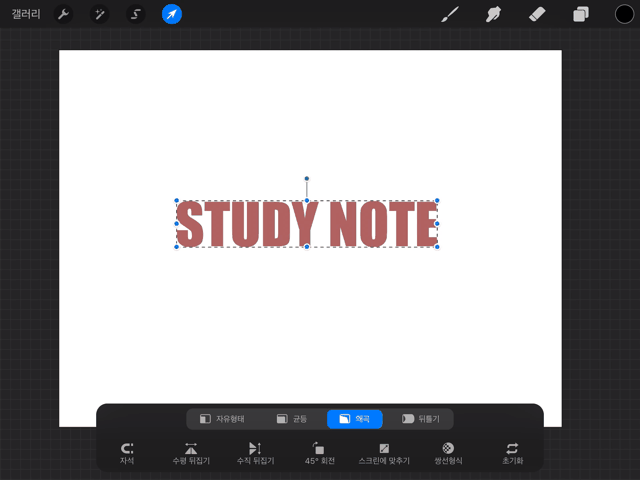 하단에 자유 형태, 균등, 왜곡, 뒤틀기 메뉴가 있는데 이 중 [왜곡]을 누릅니다. 그리고 파란색 점을 잡고 움직여줍니다. (이때 아래와 같이 상단 중앙의 파란색 점을 잡고 옮겨주세요)
