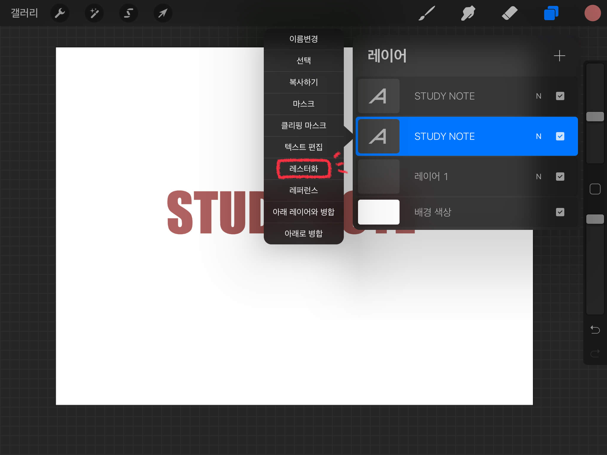 안녕하세요 도란입니다. 오늘은 아이패드 프로크리에이트 프로그램 중 텍스트 [레스터화] 기능을 알아보도록 하겠습니다.