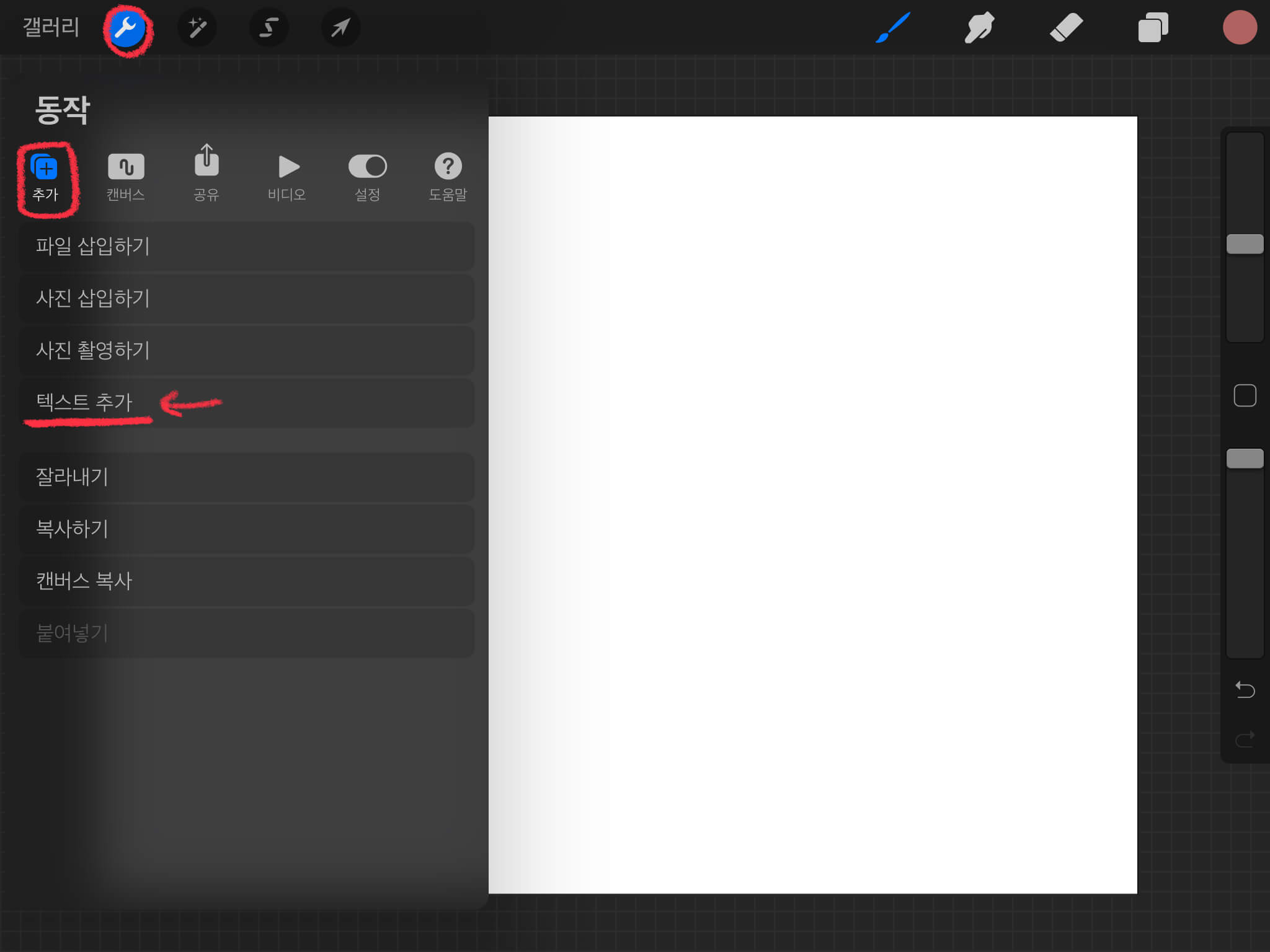 그리고 텍스트를 넣어주겠습니다. 텍스트는 [동작]-[추가]-[텍스트추가] 를 눌러서 적을 수 있습니다.