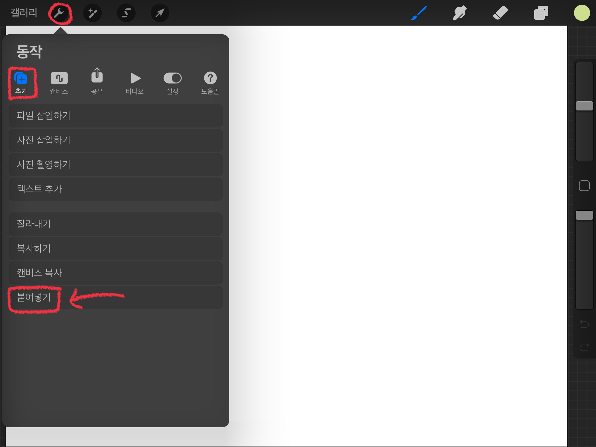 프로크리에이트의 새로운 캔버스를 열어줍니다. 도구 버튼인 [동작]을 누르고 [추가] - [붙여 넣기]를 눌러줍니다.