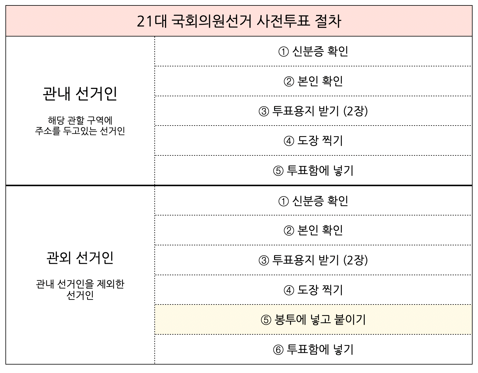 해당하는 관할 구역에서 투표를 할 경우 [관내 선거인] 이고, 그 외 다른 지역에 주소를 두고있는 사람은 [관외 선거인]입니다. 투표 절차는 관내 선거인과 관외 선거인이 조금 다릅니다. 관내 선거인은 보통 선거와 동일하게 투표용지를 투표함에 바로 넣지만, 관외 선거인은 투표용지를 봉투에 넣어서 투표함에 넣어야 합니다. 관외 선거인의 경우 봉투에 투표용지를 넣어야 한다는 점 알아두세요.
