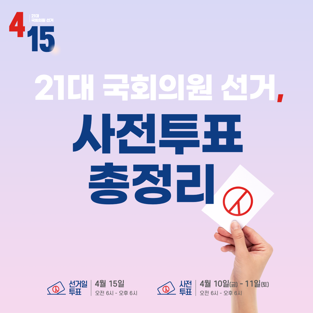올해 투표 대상은 선거일 기준으로 만 18세 이상 국민으로 2002년 4월 16일 이전 출생자 입니다. 사전 투표기간은 2020년 4월 10일 금요일과 4월 11일 토요일 총 2일간 진행됩니다. 시간은 오전 6시부터 오후6시까지 입니다. 사전 투표시 준비물은 신분증과 마스크 입니다.