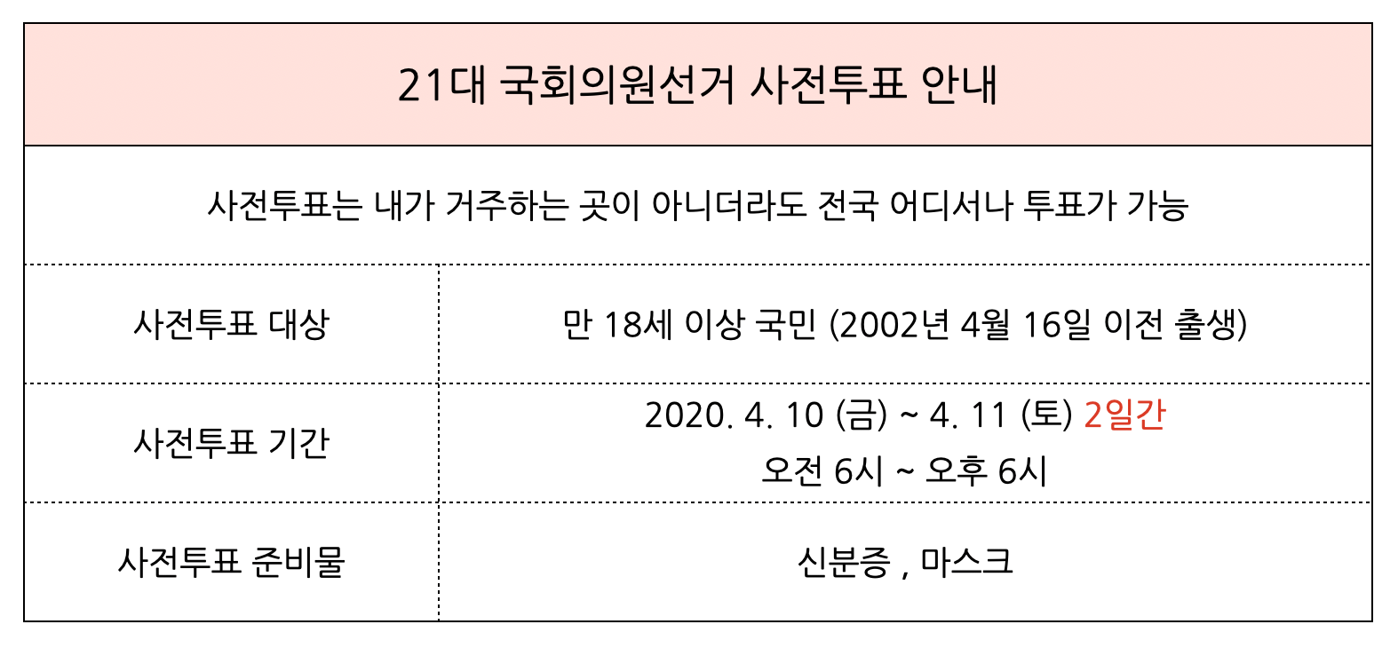 올해 투표 대상은 선거일 기준으로 만 18세 이상 국민으로 2002년 4월 16일 이전 출생자 입니다. 사전 투표기간은 2020년 4월 10일 금요일과 4월 11일 토요일 총 2일간 진행됩니다. 시간은 오전 6시부터 오후6시까지 입니다. 사전 투표시 준비물은 신분증과 마스크 입니다.