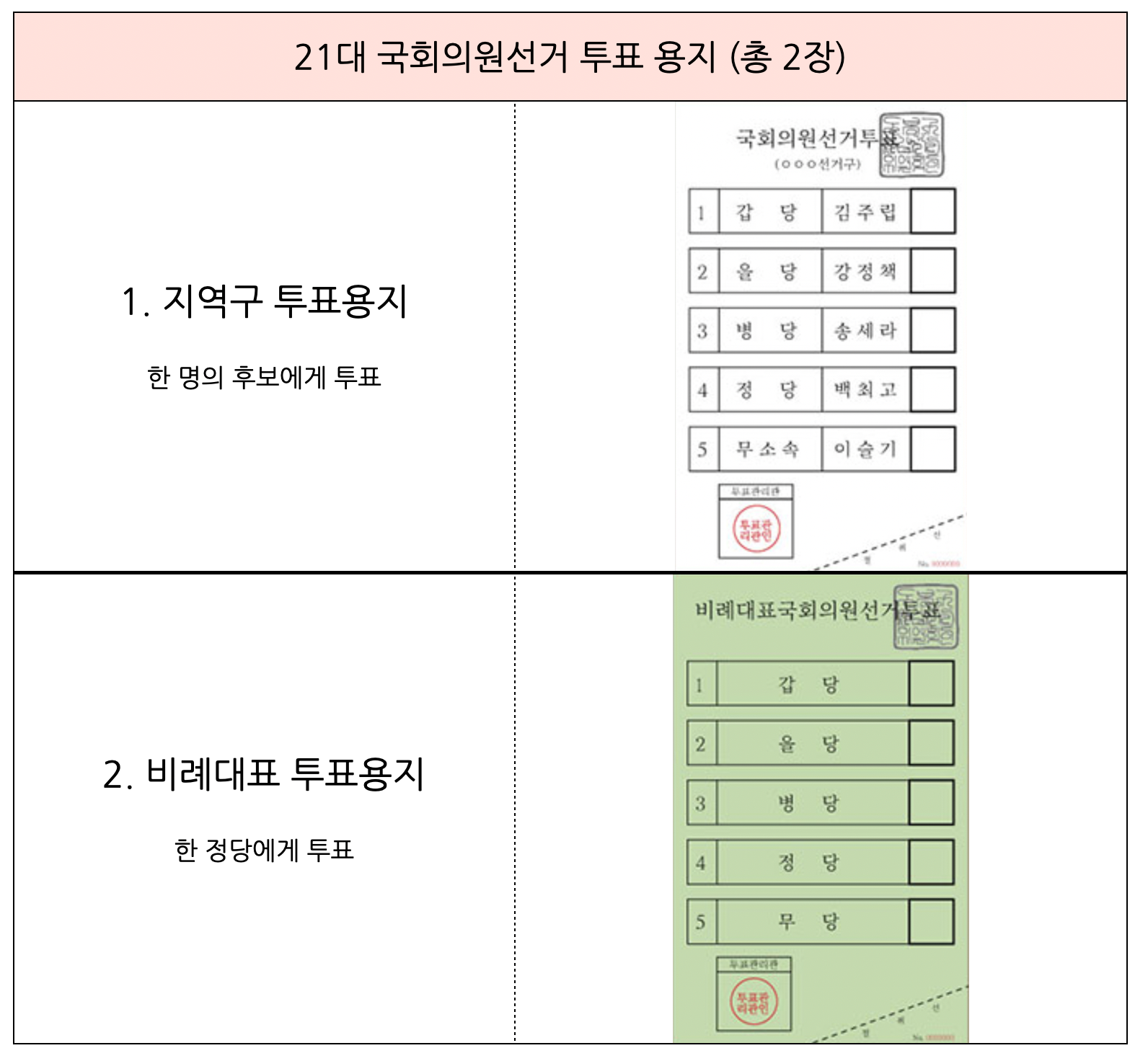 투표시 투표용지는 총 2장을 받게 됩니다. 한장은 지역구 국회의원 투표용지이며 나머지 한장은 비례대표 정당 투표용지 입니다. 모두 한 곳에만 투표를 해야합니다. 사전투표 용지에는 아래 일련번호 대신 바코드가 적혀 있습니다. 사전에 자택으로 배달된 선거 우편에 들어있는 지역구 국회의원 후보와 비례대표 정당을 꼼꼼하게 확인하신 후 투표하세요.