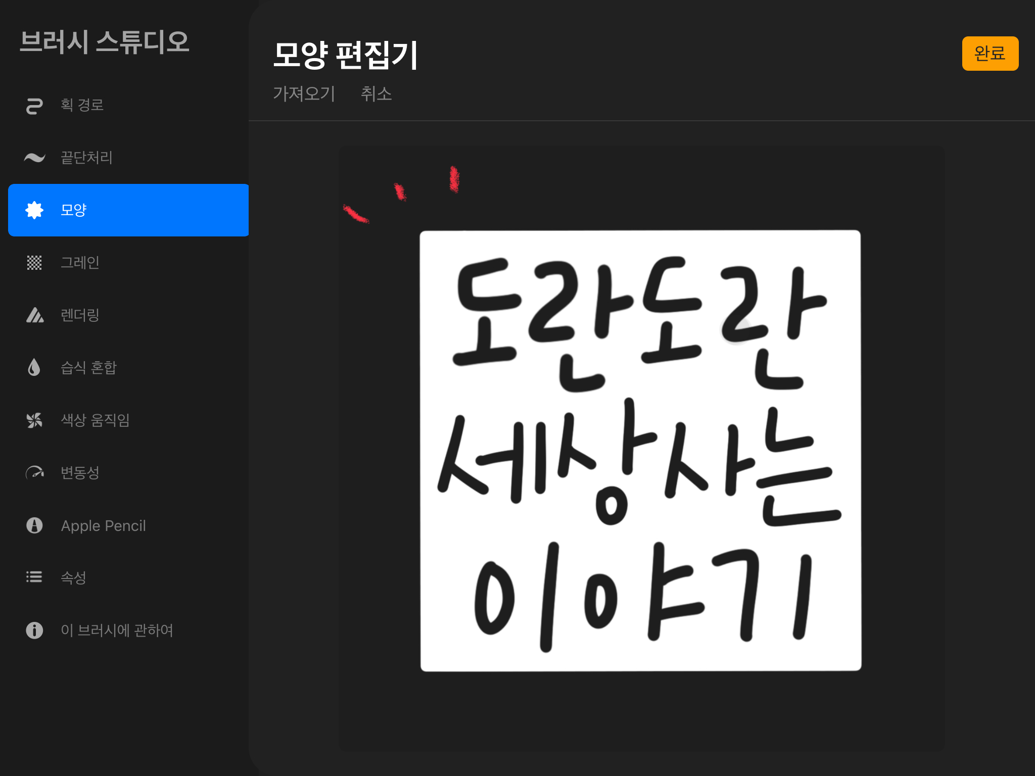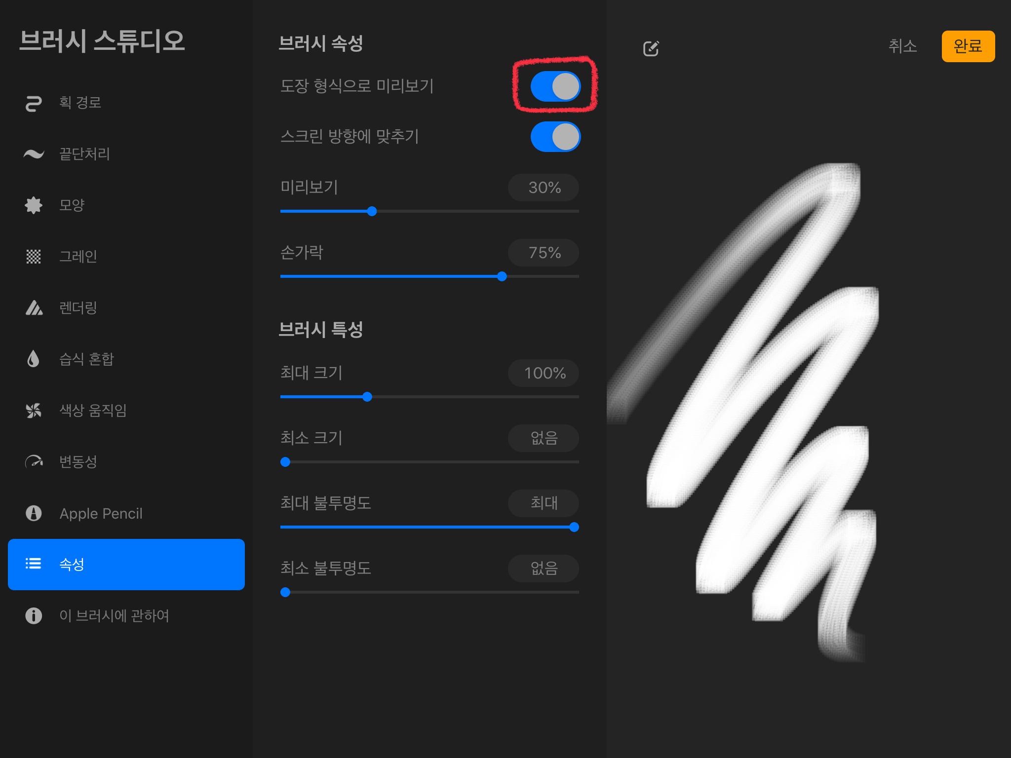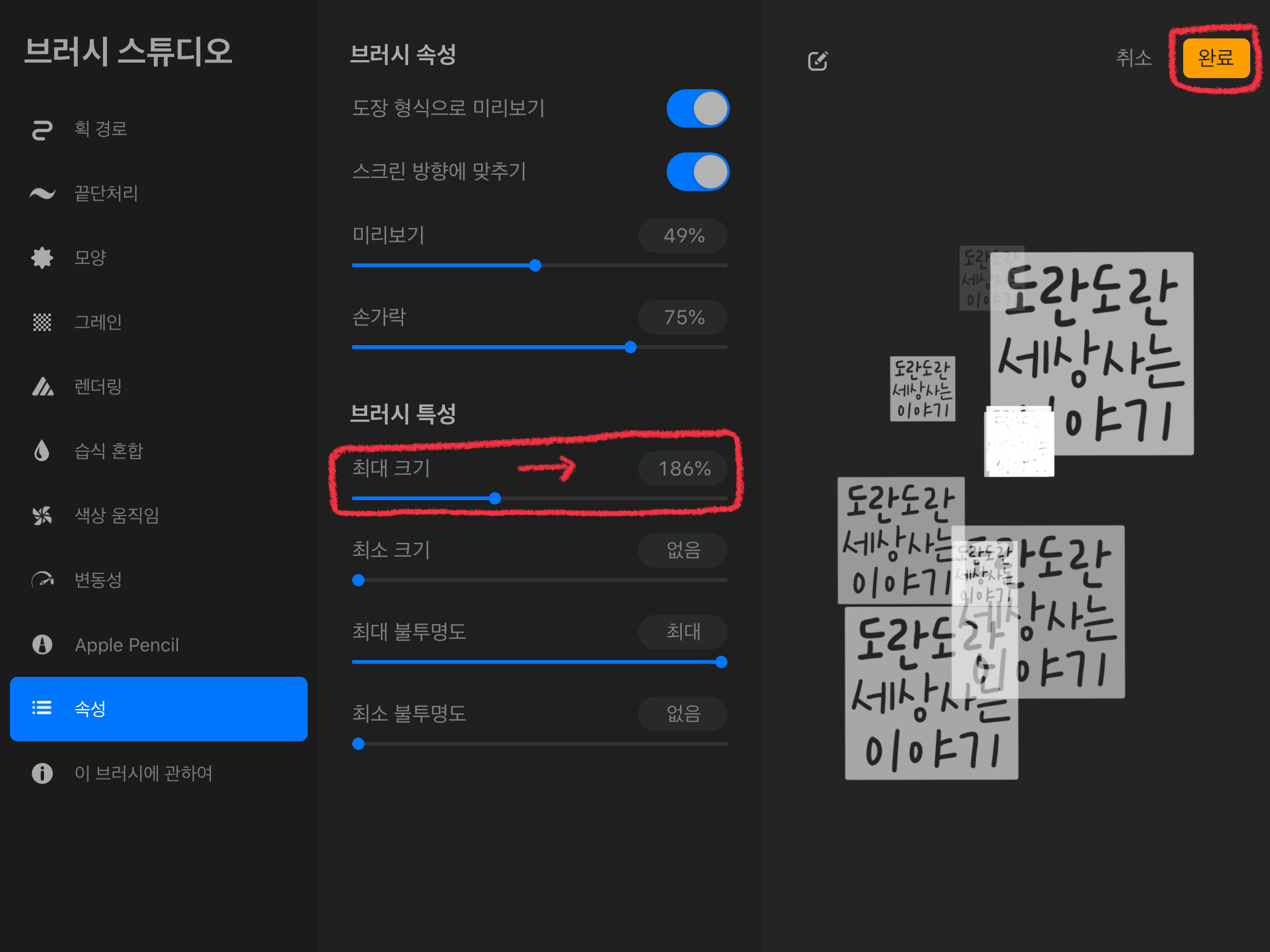 그리고 [브러시 특성]에서[최대 크기]를 조절해줍니다. 원하는 크기로 조절해준 뒤 [완료] 버튼을 눌러줍니다.