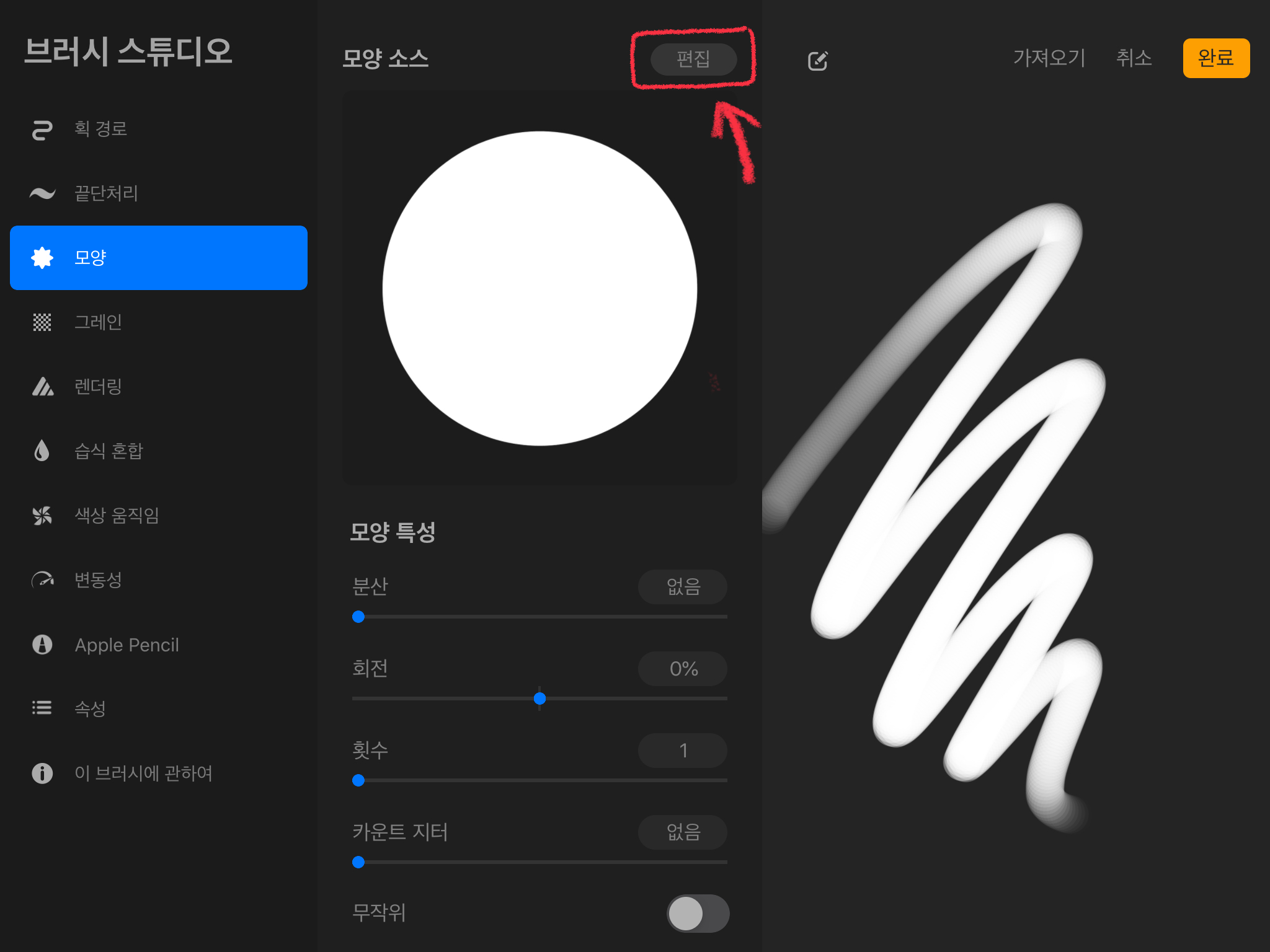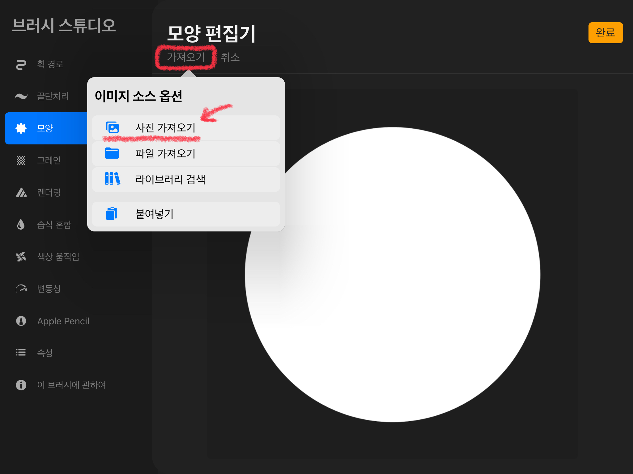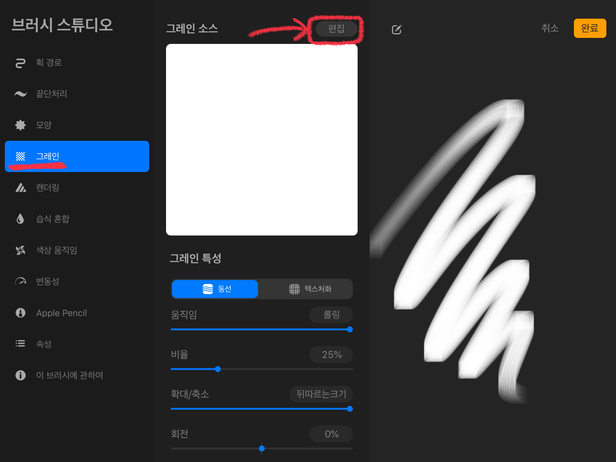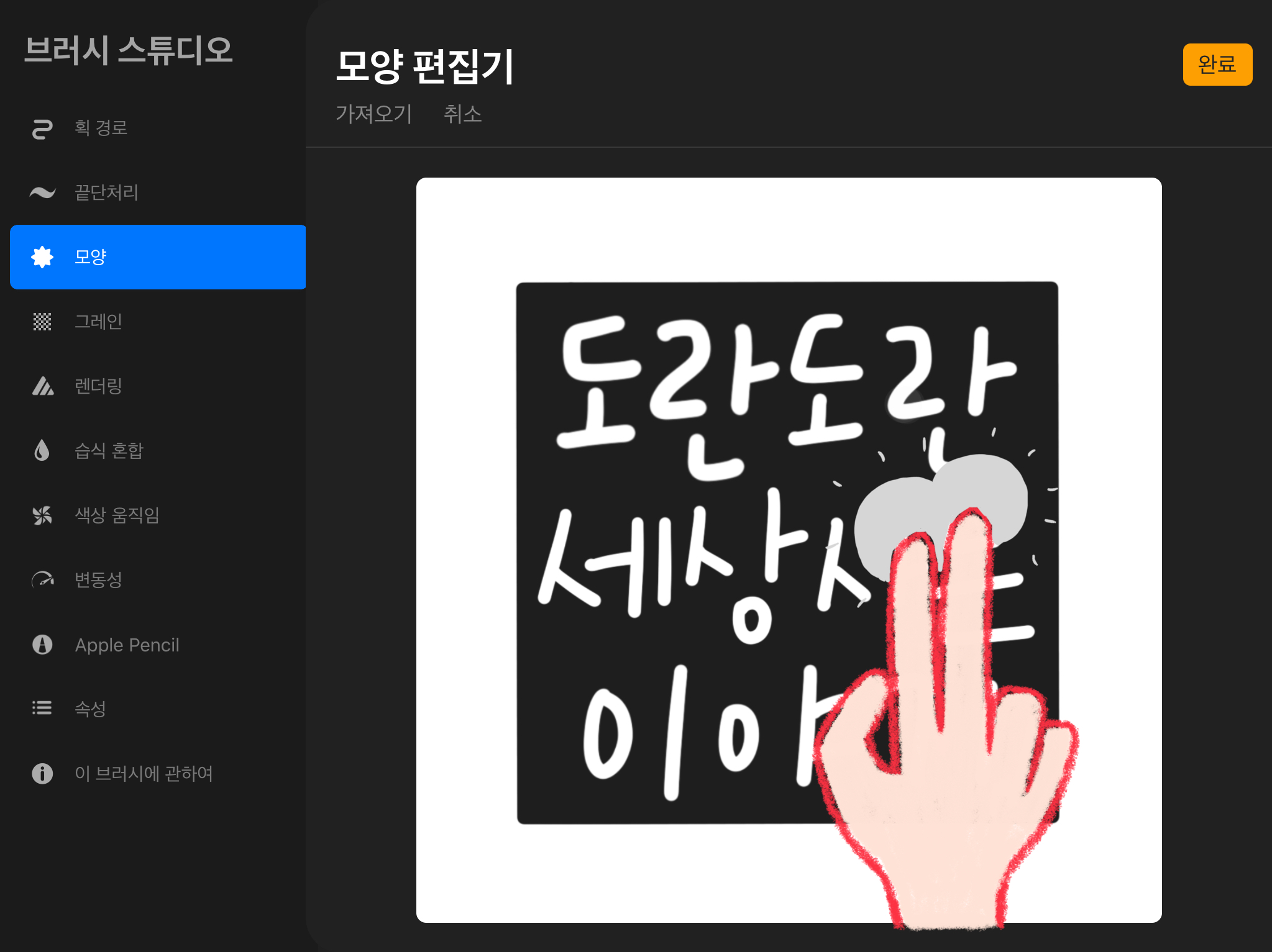 그리고 [브러시 특성]에서[최대 크기]를 조절해줍니다. 원하는 크기로 조절해준 뒤 [완료] 버튼을 눌러줍니다.