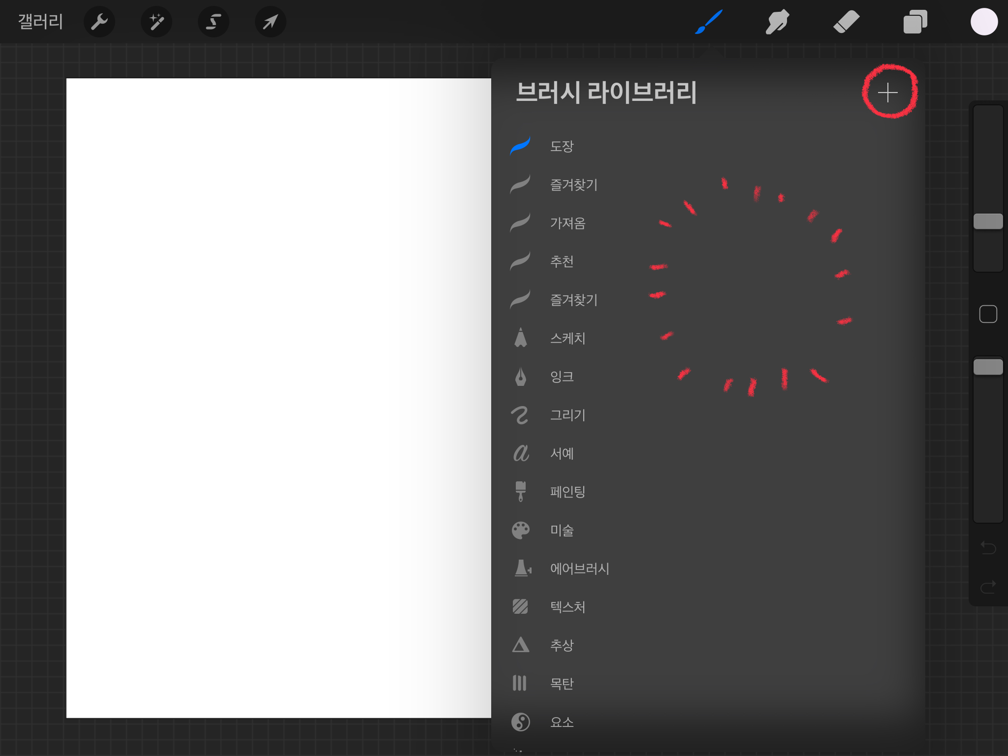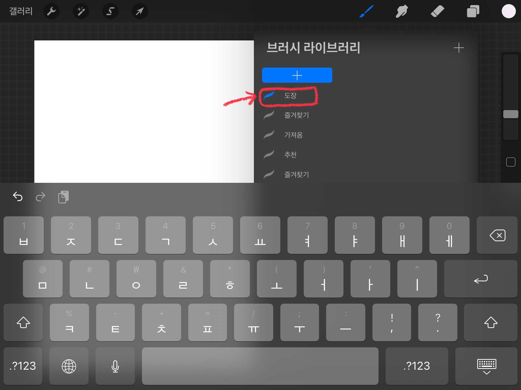 이때는 도장을 추가하기위한 캔버스를 열어주는 것이기 때문에 캔버스 크기는 상관이 없습니다. 브러시 버튼을 누른 뒤 [+] 버튼을 누릅니다. 새로운 브러시를 추가하는 버튼입니다. 평소에는 보이지 않지만 아래로 쓱 쓸어주면 나타납니다.