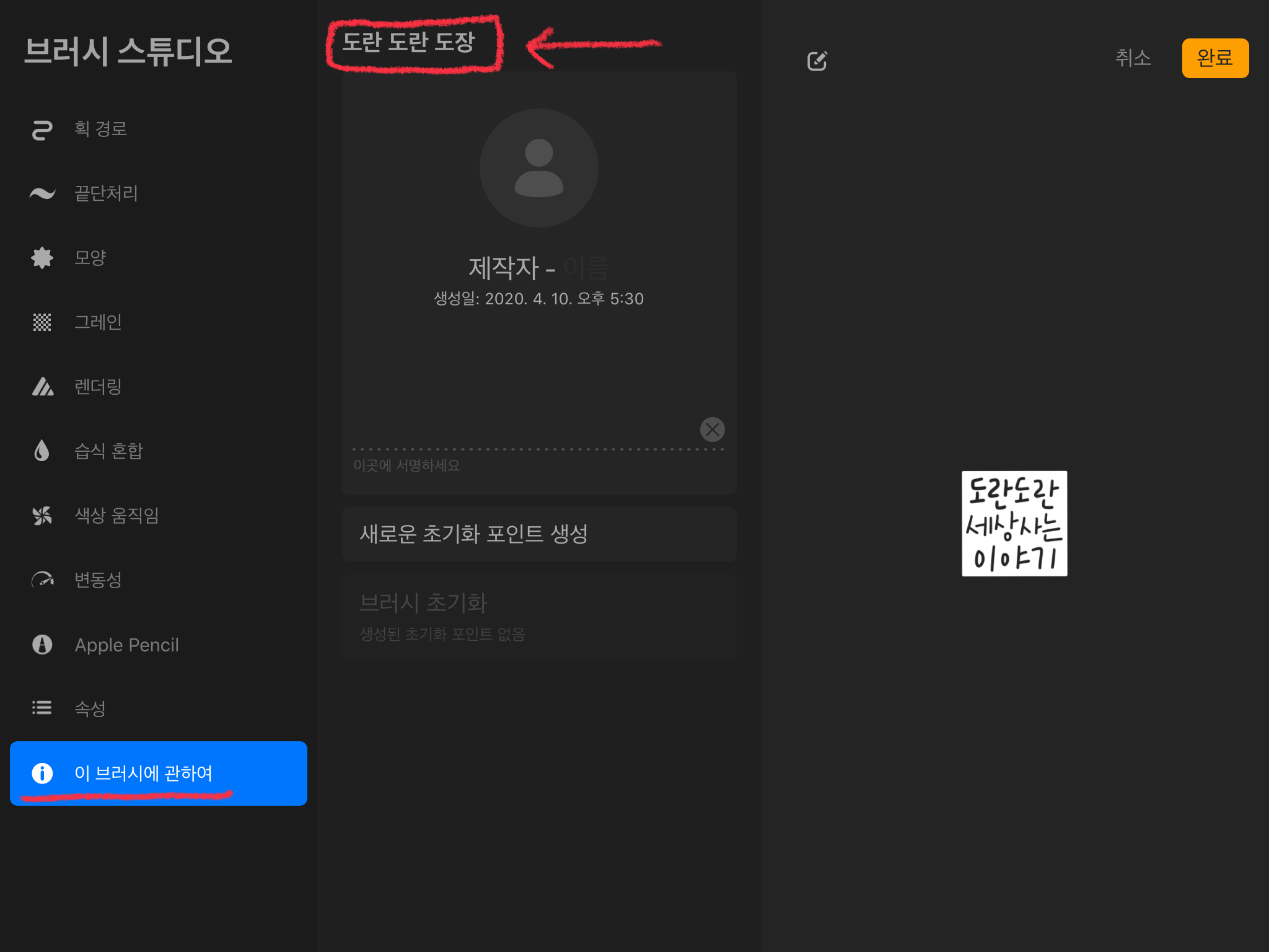* 추가적으로 브러시 이름을 설정하고 싶을 때는 [이 브러시에 관하여]를 누른 뒤 이름과 만든 사람 정보를 수정하면 됩니다.