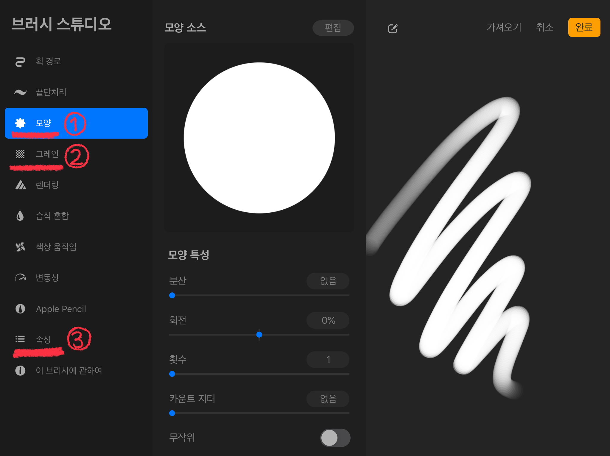 우측 상단 [+] 버튼을 누르면 브러시 스튜디오가 나옵니다. 우리는 이 많은 메뉴에서 모양, 그레인, 속성, 이 3가지를 설정해 줄 예정입니다.