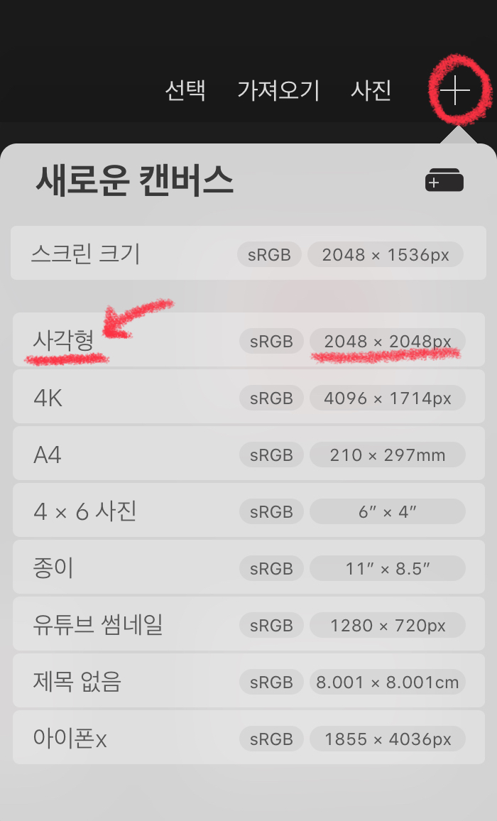 프로크리에이트를 실행한 뒤 새로운 캔버스를 만들어 주세요. 이때 [정사각형]으로 만들어줍니다. (브러시 모양이 정사각형 모양으로 적용되기 때문입니다.)