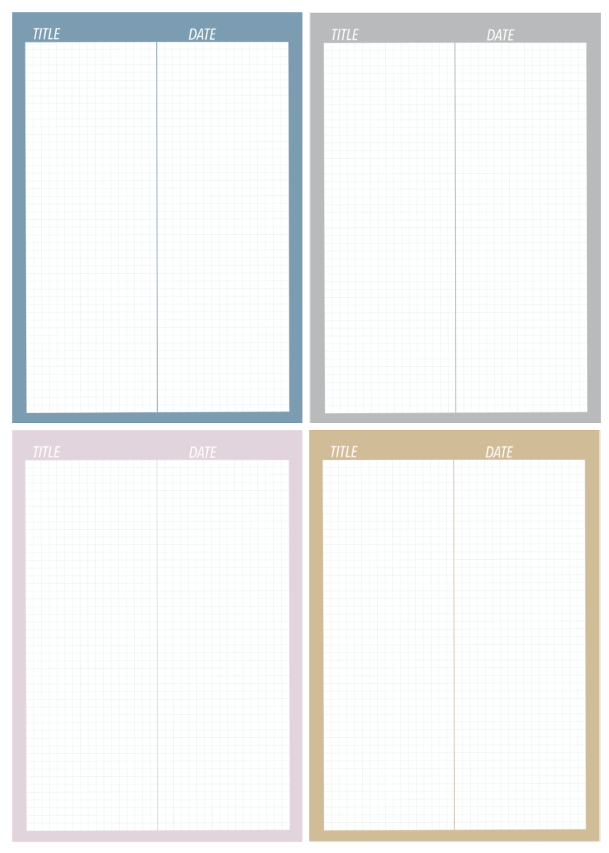 색상은 총 4가지 입니다. 물론 제가좋아하는 취향이 전적으로 반영되었습니다. 전에 공유해드렸던 모눈종이 4종에는 초록색이 있었는데요 제가 쓰다보니 초록색은 한번도 사용하지 않더라고요. 그래서 과감히 빼고 회색을 넣었습니다. 글씨도 큼지막하게 타이틀과 날짜를 넣었습니다. PDF파일은 포스팅 맨 아래에서 다운로드 할 수 있습니다.