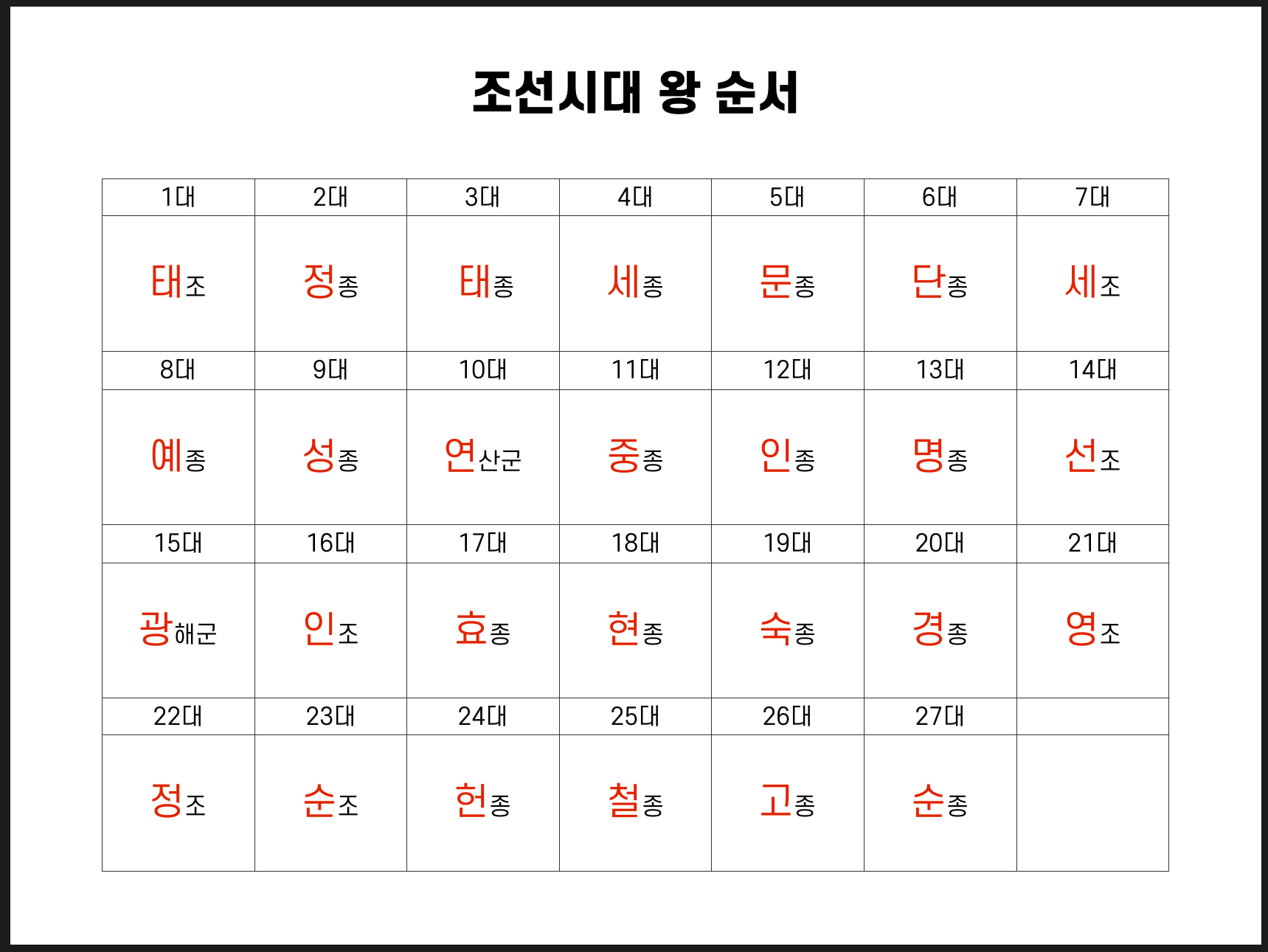 어릴 때 외워두었던 조선왕조 순서가
