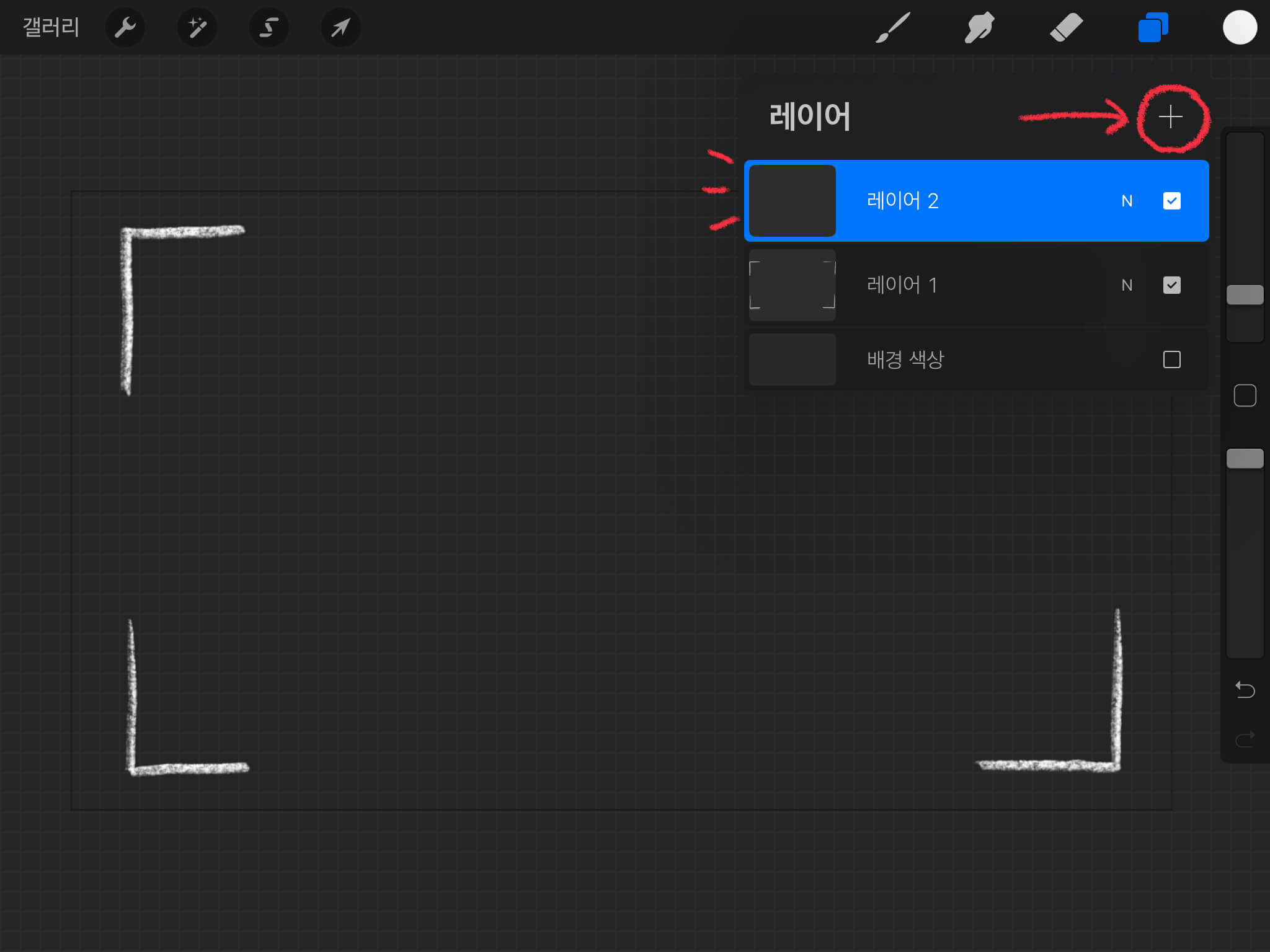 아래와 같이 테두리를 그린 뒤 [새로운 레이어 추가]를 해줍니다. 2번 레이어 위에도 똑같이 테두리를 그려줍니다. (똑같이 그려도 굵기와 길이가 약간씩 다르기 때문에 레이어 1번과 똑같이 그려주세요)