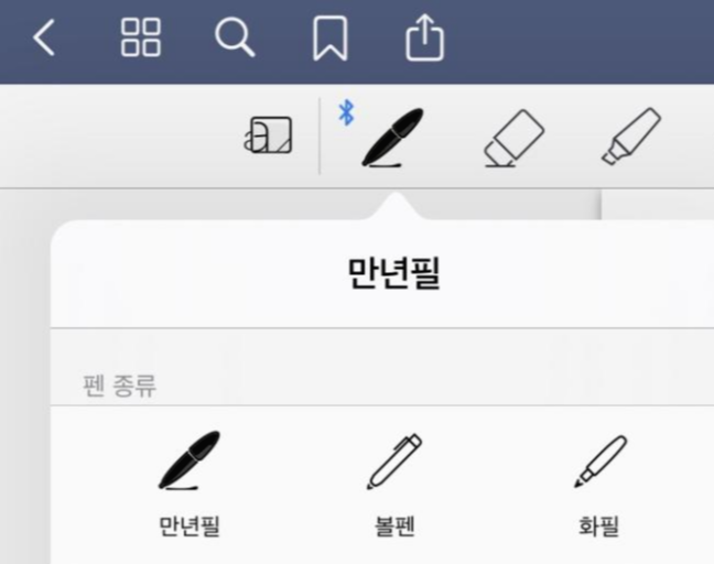 첫번째는 가장 많이 사용하는 주요 도구인 '펜' 도구 툴입니다. 현재 굿노트5에서는 만년필, 볼펜, 화필 이렇게 3가지 종류의 펜을 제공하고 있습니다. 개인적으로 '만년필'을 가장 많이 사용하고 있습니다. 각 펜마다의 특징이 다르며, 굵기와 색깔 변경이 가능합니다.