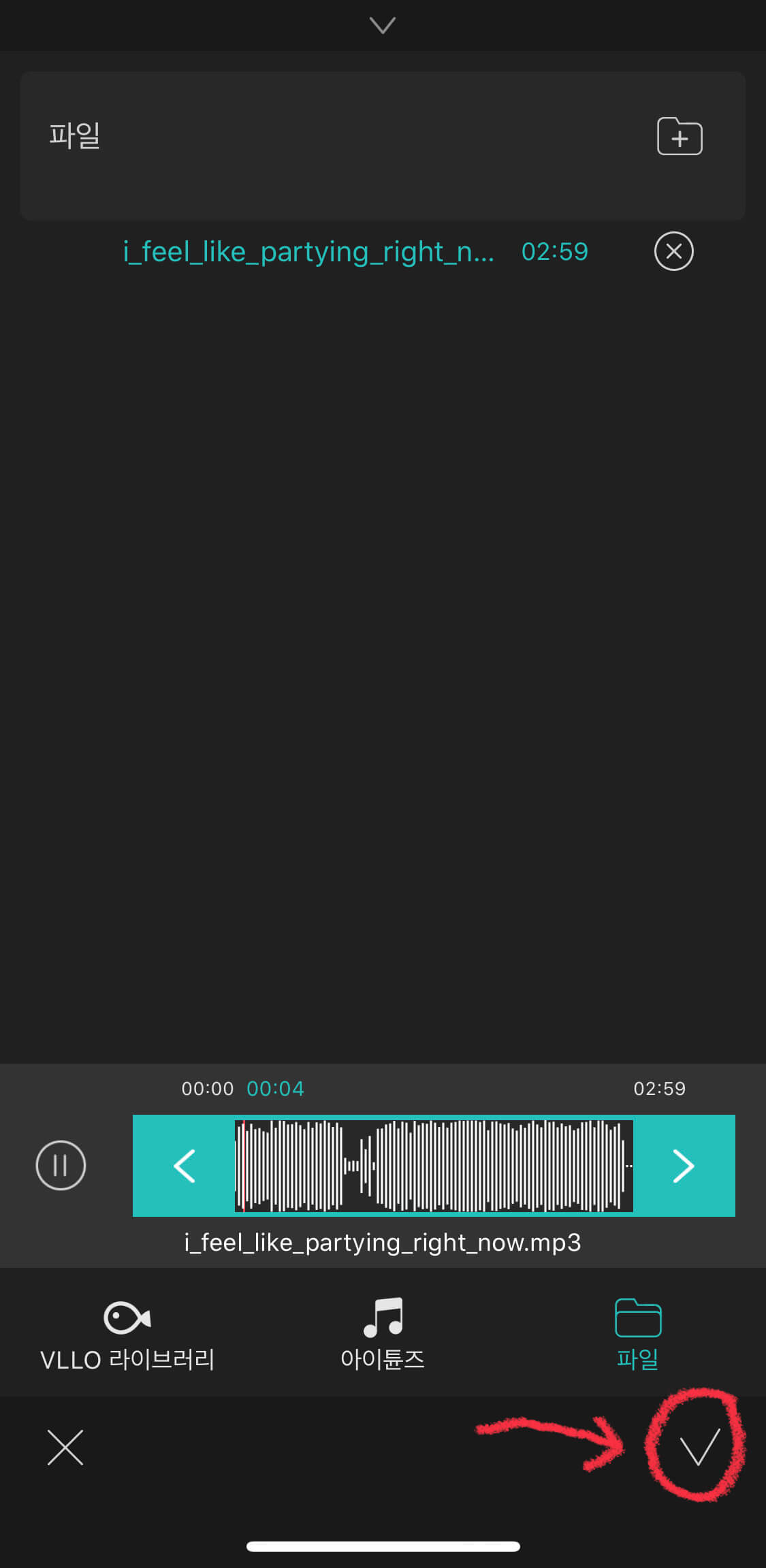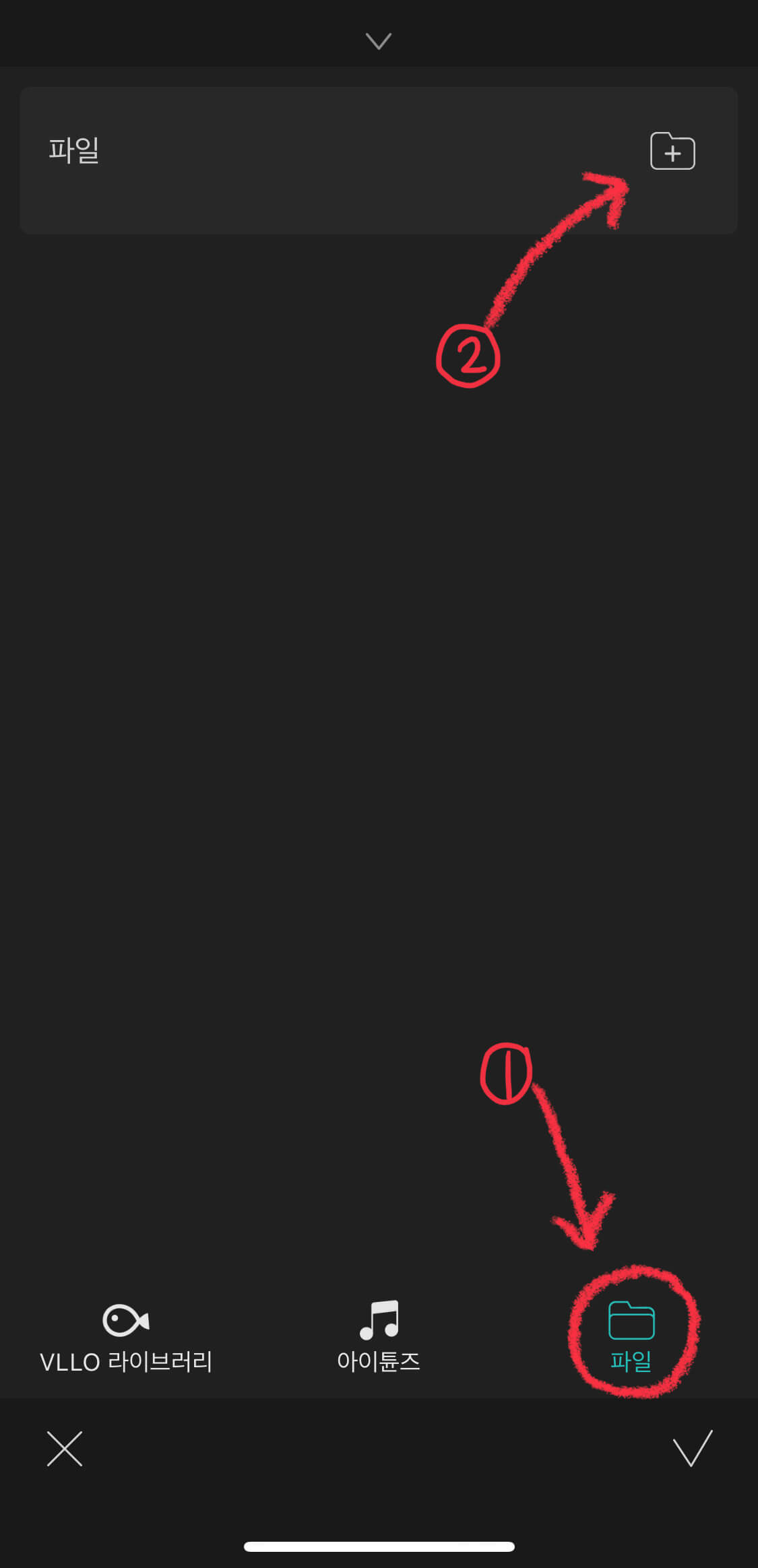 VLLO 라이브러리 메뉴에서 음악을 선택할 수 있지만, 우리는 외부에서 음원을 가져올 예정이기 때문에 하단 오른쪽에 있는 [파일]을 눌러주세요. 그리고 파일 [+] 를 눌러서 외부 음원을 가져옵니다.