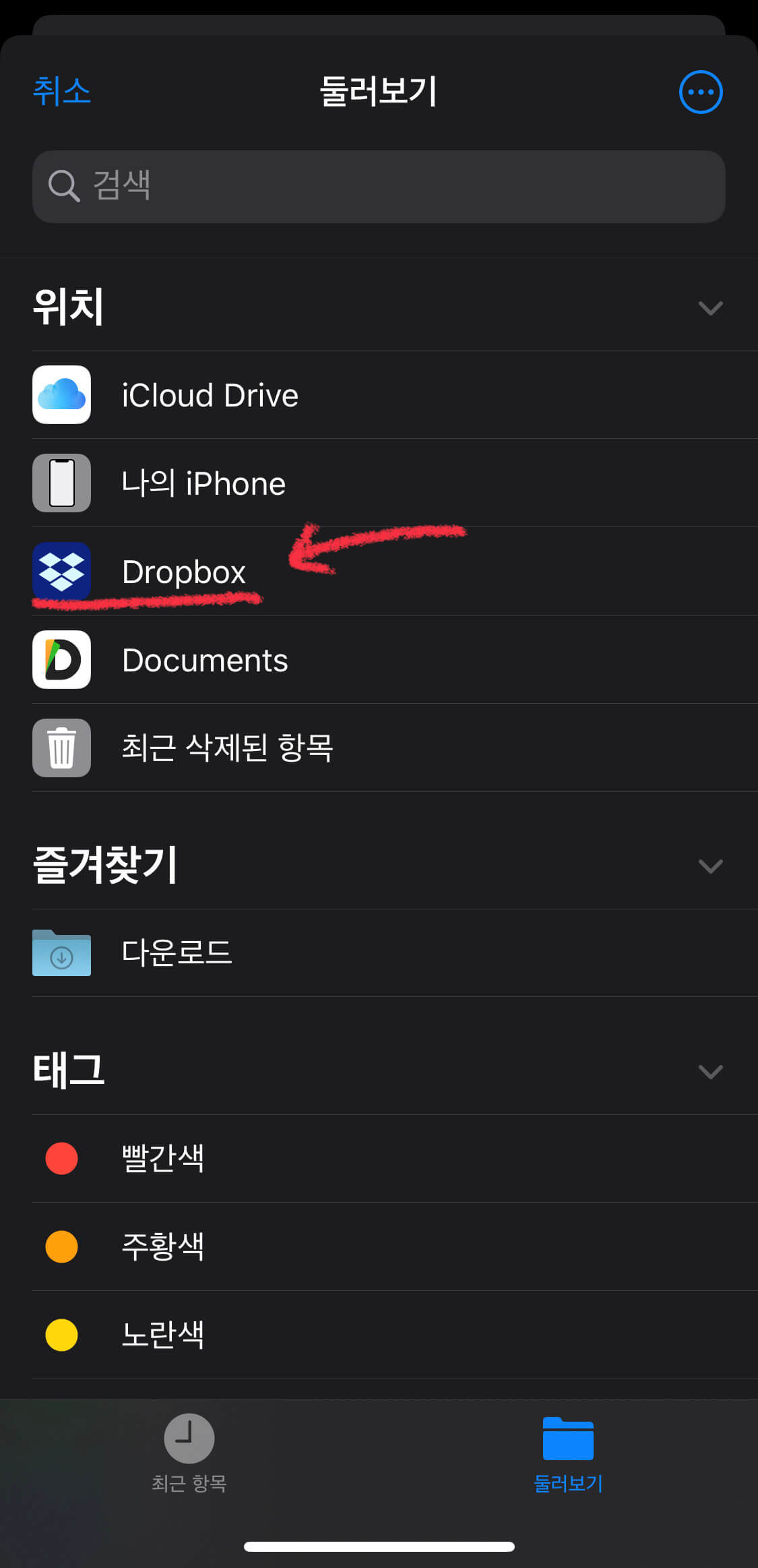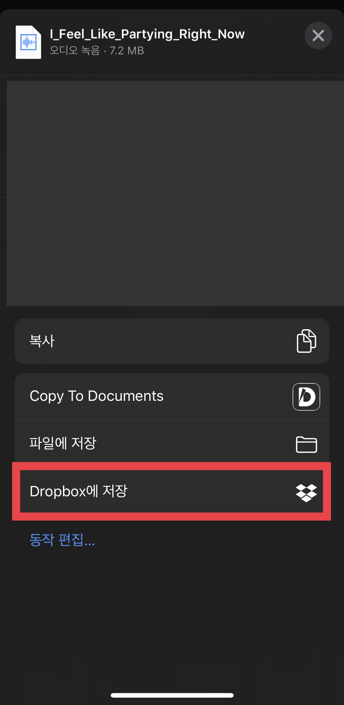 그리고 화면을 아래로 쓸어 아래에 나오는 [Dropbox에 저장]을 눌러줍니다. 그리고 드롭박스 안에 원하는 곳에 저장을 해줍니다.