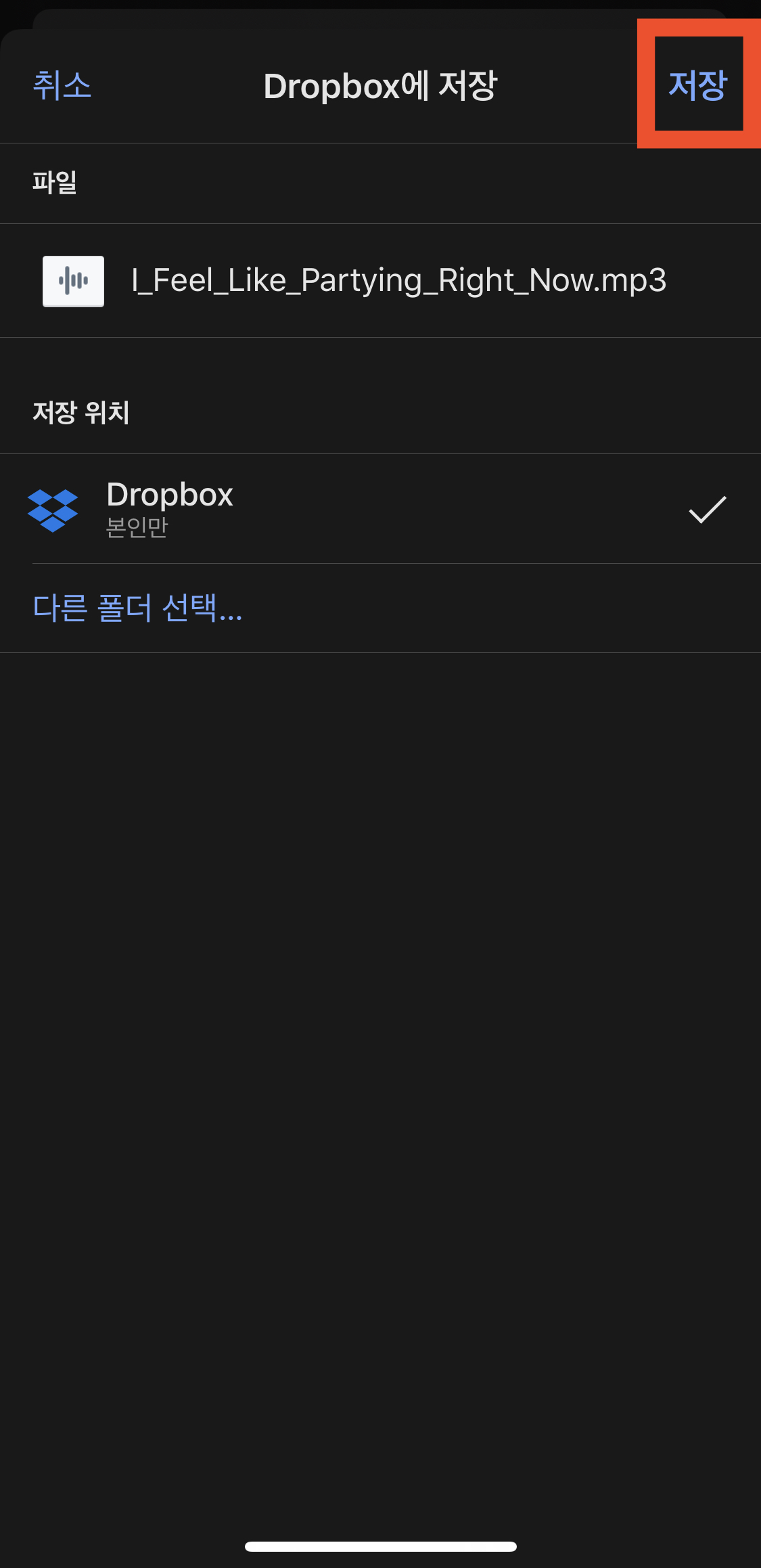 그리고 화면을 아래로 쓸어 아래에 나오는 [Dropbox에 저장]을 눌러줍니다. 그리고 드롭박스 안에 원하는 곳에 저장을 해줍니다.