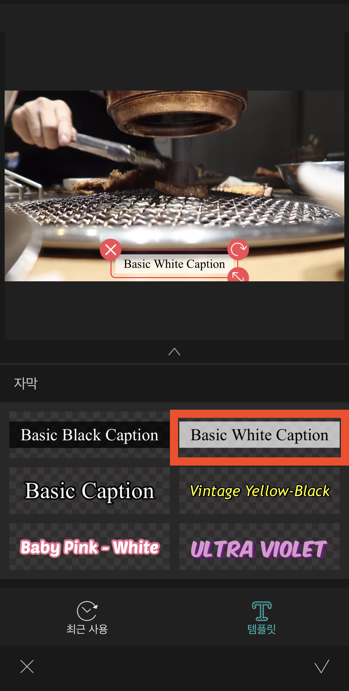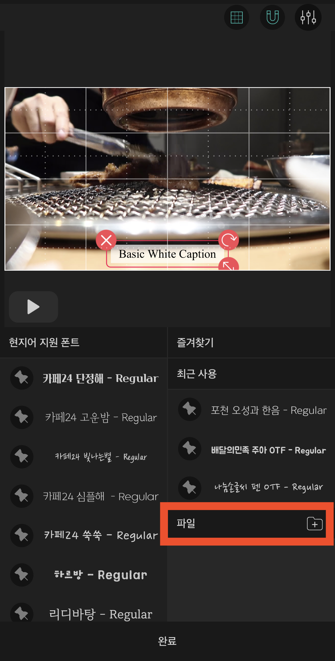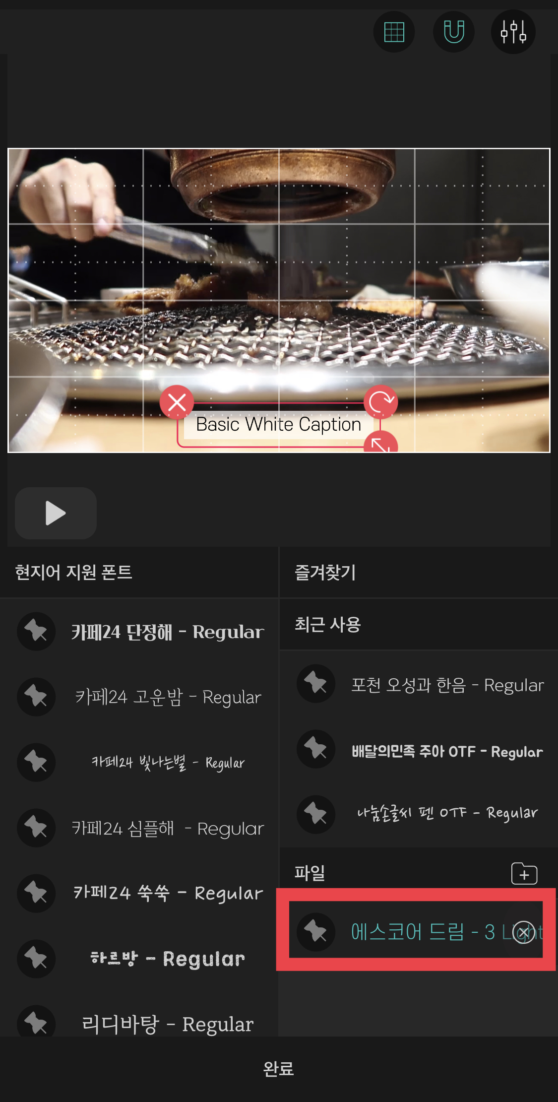 여러 글자의 형태가 나옵니다. 여기서 마음에 드는 글자를 선택해주세요. 저는 자막에 있는 흰색 배경에 검은색 글씨를 선택했습니다. [완료]를 눌러주면 아래 오른쪽과 같이 글자를 편집할 수 있는 메뉴창이 나옵니다.