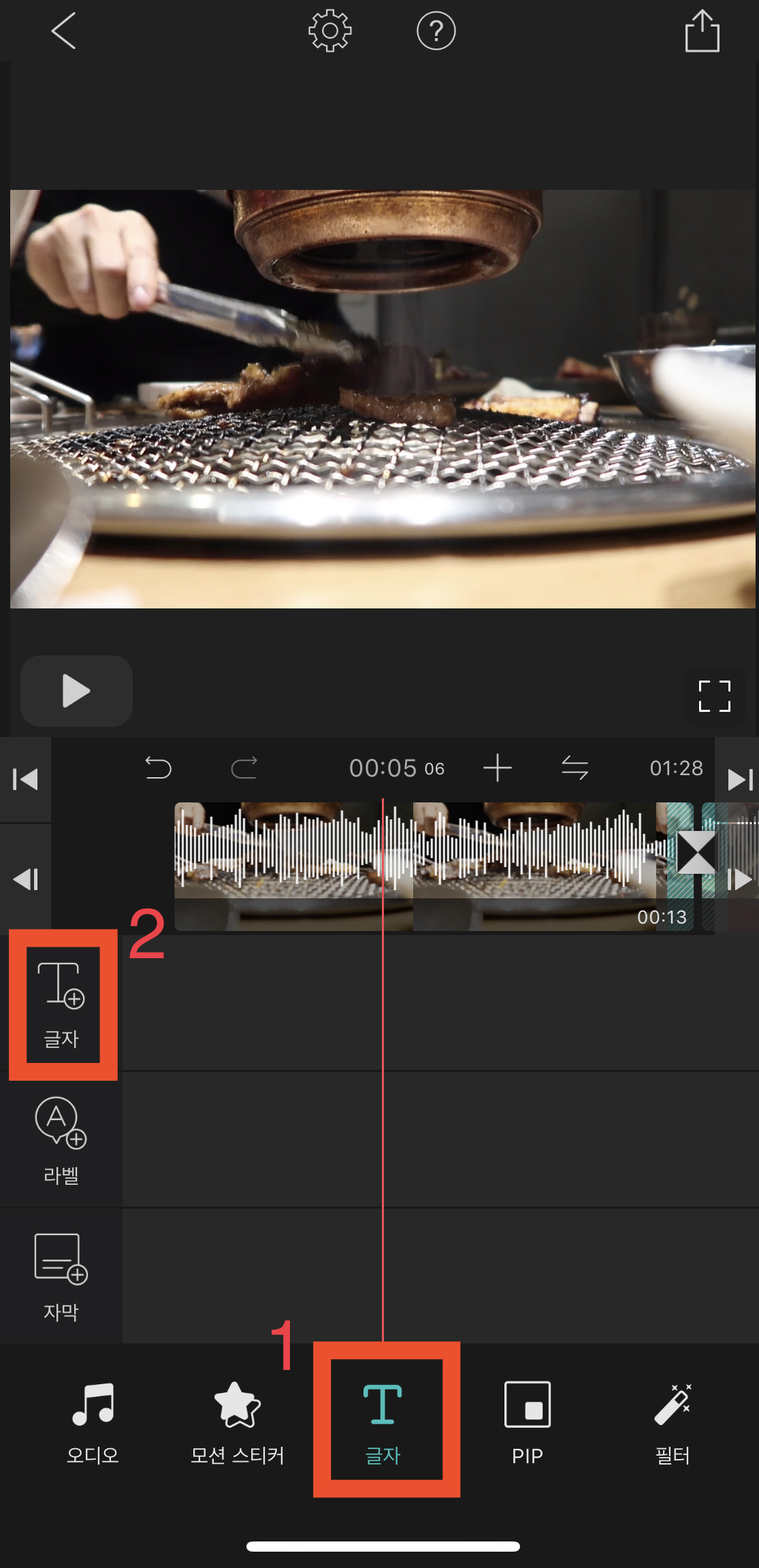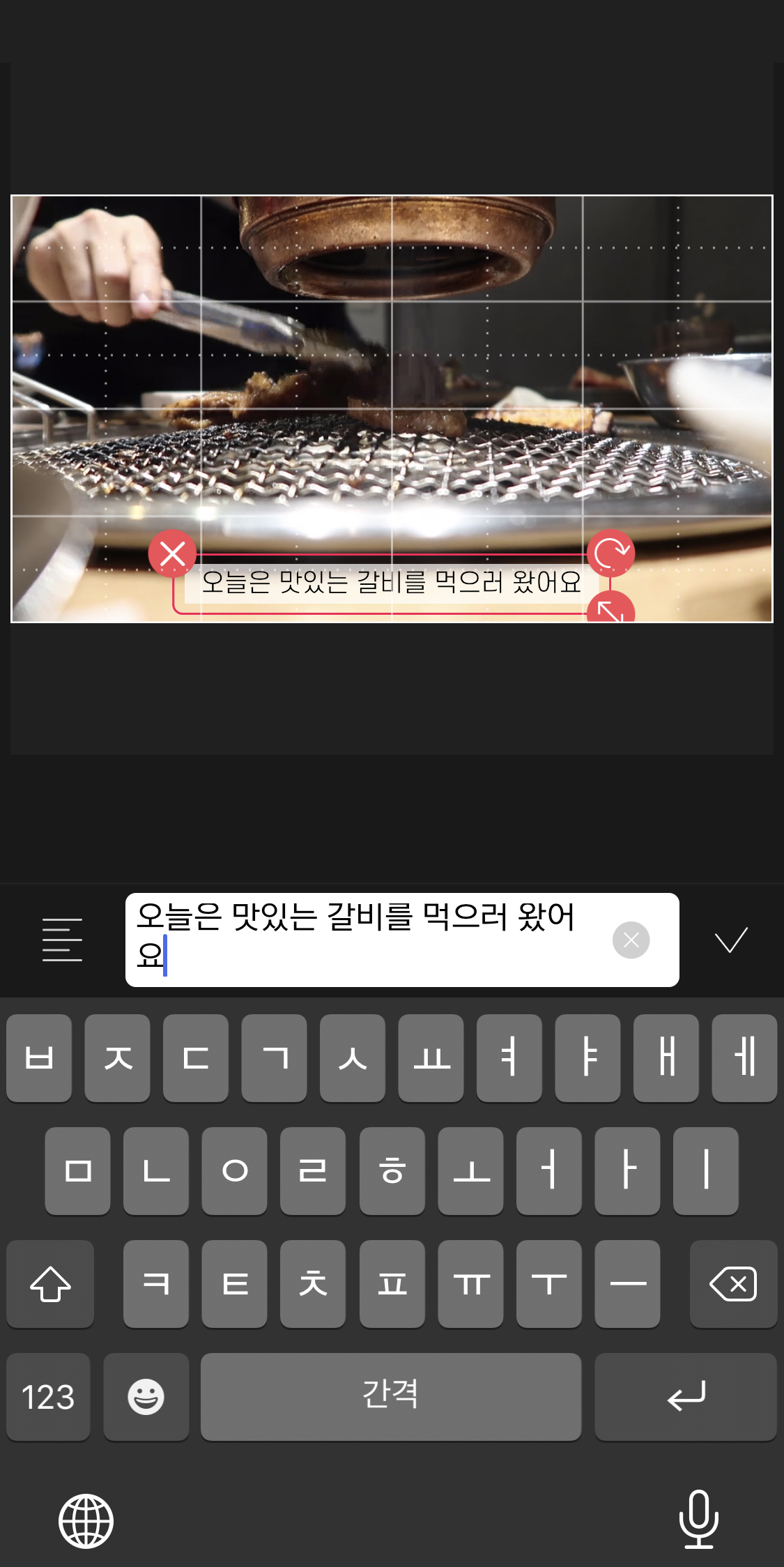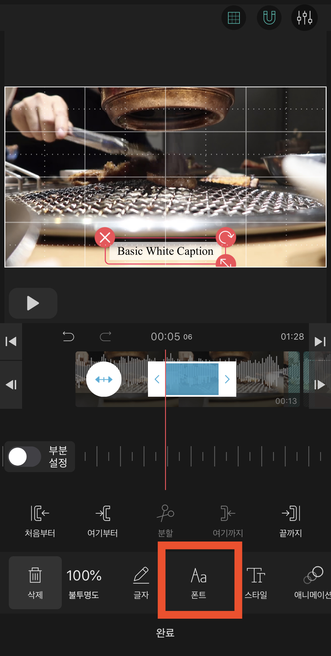 여러 글자의 형태가 나옵니다. 여기서 마음에 드는 글자를 선택해주세요. 저는 자막에 있는 흰색 배경에 검은색 글씨를 선택했습니다. [완료]를 눌러주면 아래 오른쪽과 같이 글자를 편집할 수 있는 메뉴창이 나옵니다.