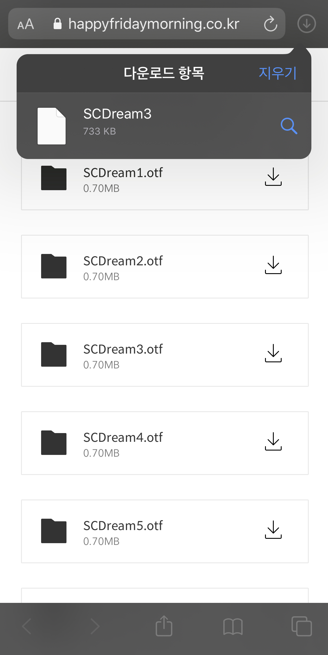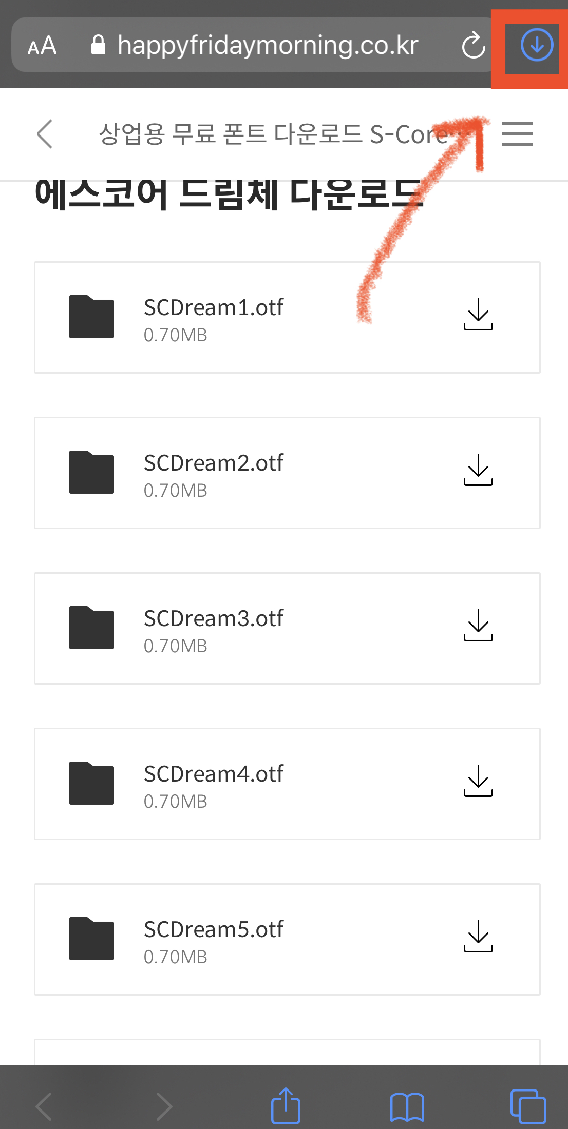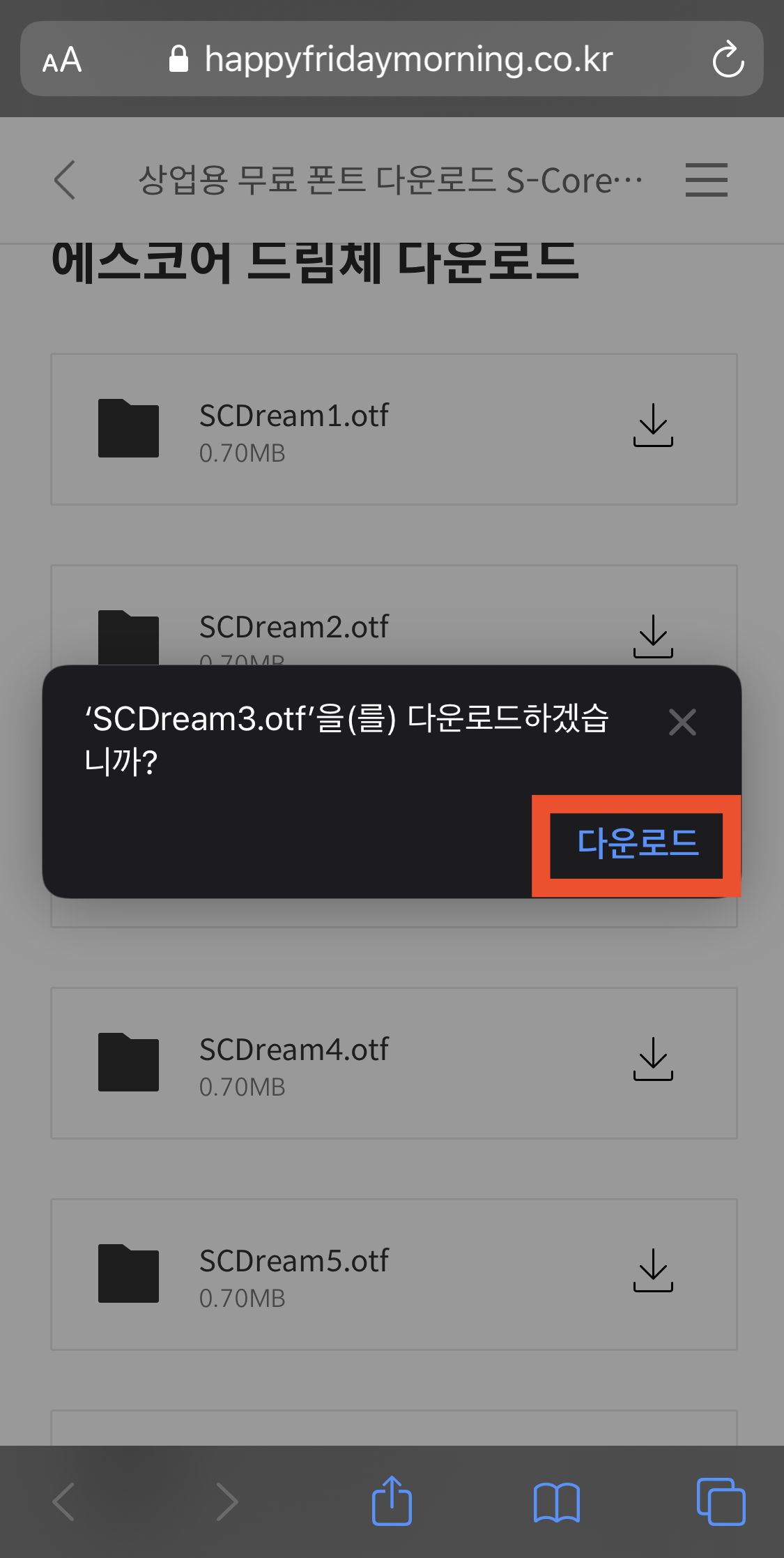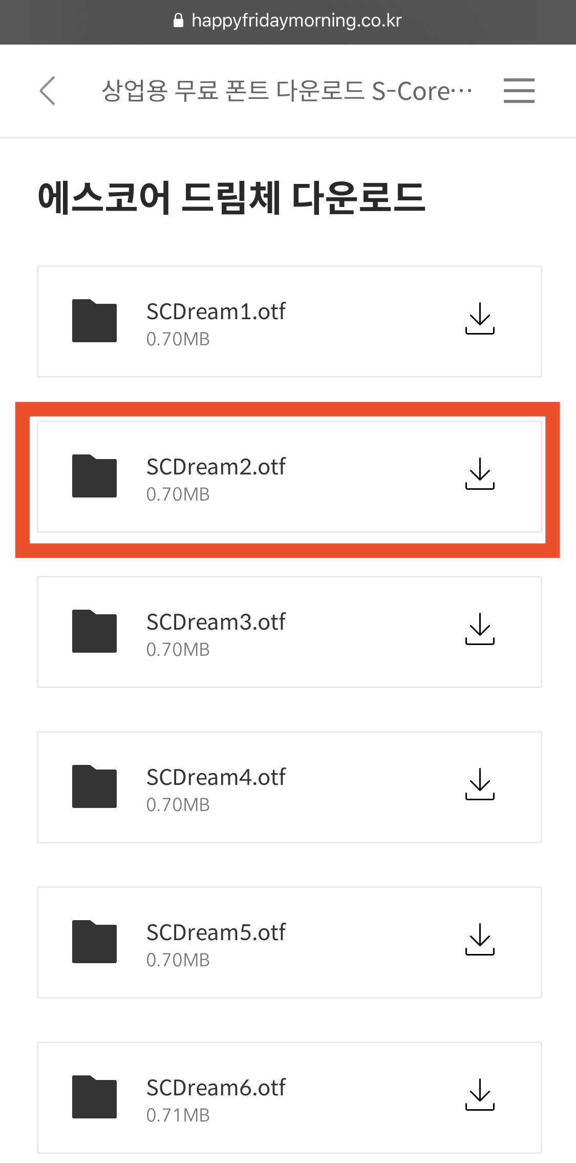 가장 먼저 사용하려는 폰트를 다운로드해야겠죠. 저는 에스코어 드림체를 사용할 예정입니다. 저와 같이 에스코어 드림체를 다운로드하고자 하는 분들은 아이폰 [Safari]에서 아래 주소로 들어가신 후 다운로드하세요.
