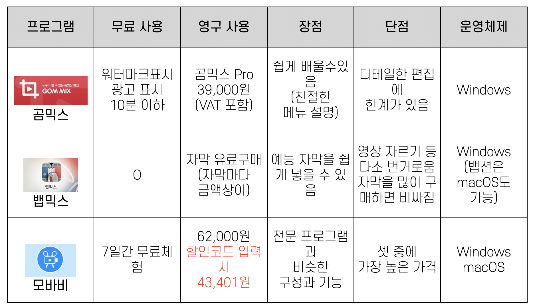 유튜브 초보 영상 편집 PC 프로그램으로는 곰믹스, 뱁믹스, 모바비 movavi 가 대표적입니다. 이 세 가지 프로그램을 간단하게 비교해보도록 하겠습니다.