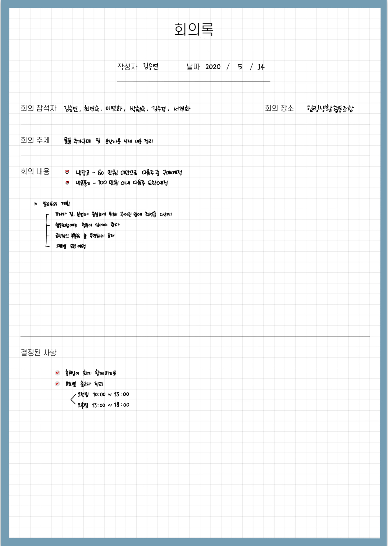이런 식으로 작성하시면 될 것 같습니다. 아마도 회의가 자주 있는 직장인 분들은 더욱 잘 적으실 수 있을 거라 생각됩니다.