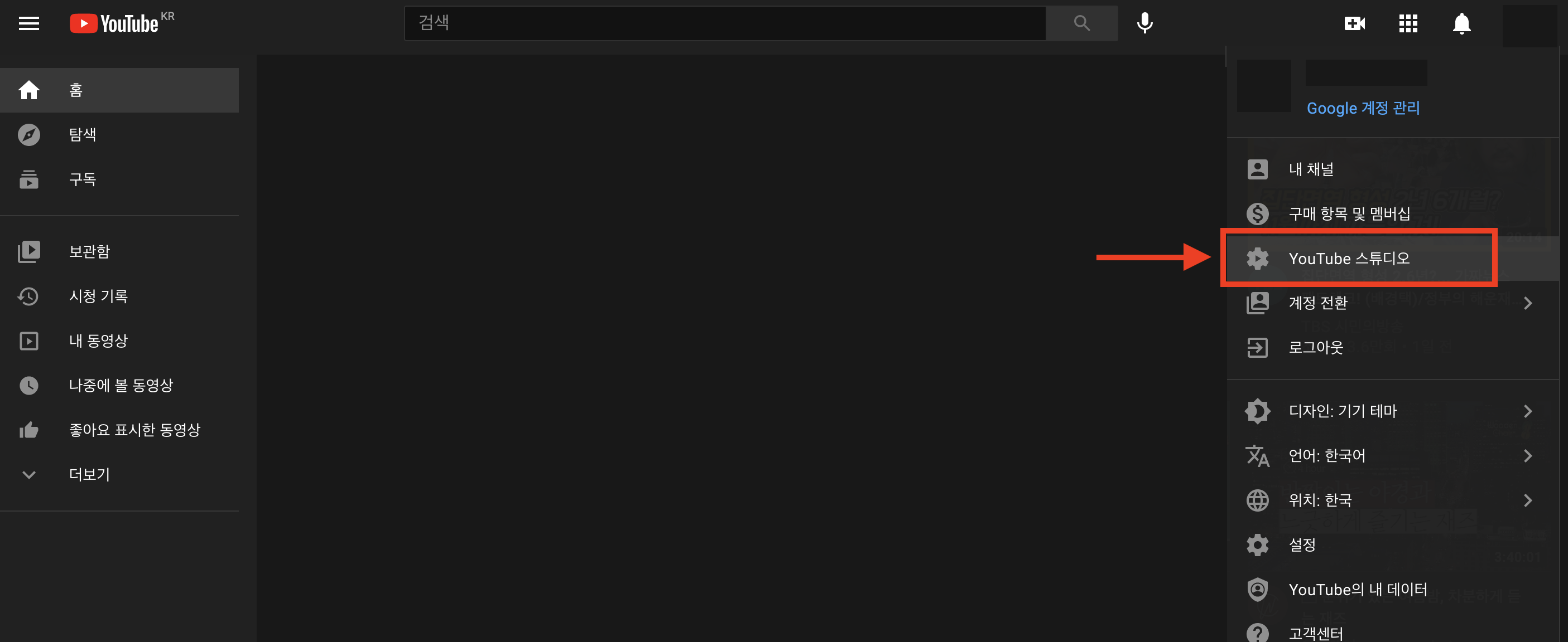 유튜브 화면에 가더라도 오디오 라이브러리로 이동하는 화면을 찾기가 어렵습니다. 오디오 라이브러리 링크는 유튜브 화면이 아닌 채널을 가지고 있는 분들이 이용하는 [유튜브 스튜디오] 메뉴 페이지에 있습니다.