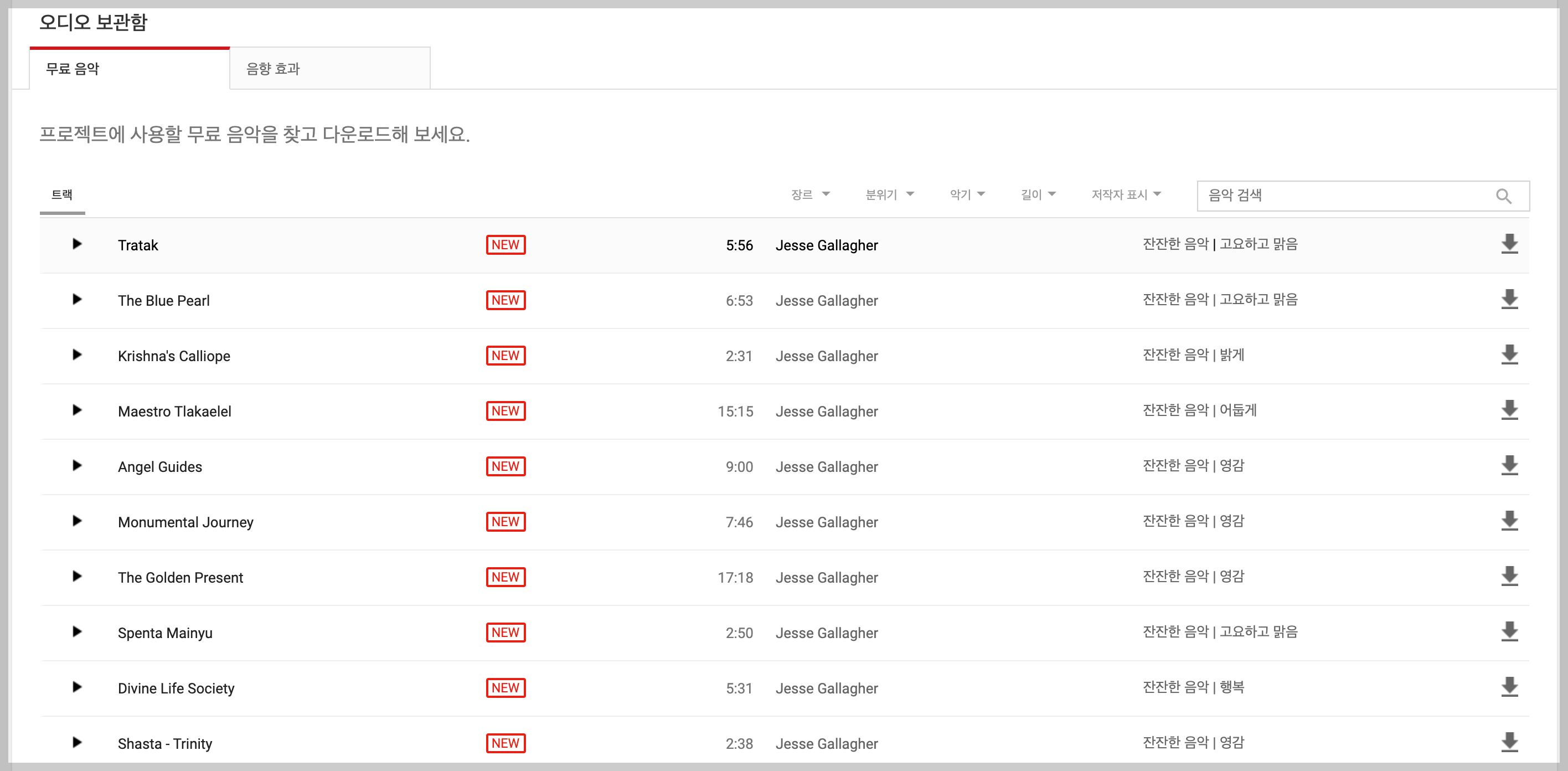 유튜브 오디오 라이브러리에 접속하면 아래와 같은 화면이 나옵니다. 이 곳에서 음원을 다운로드 한 뒤 본인이 만든 영상에 사용할 수 있습니다.