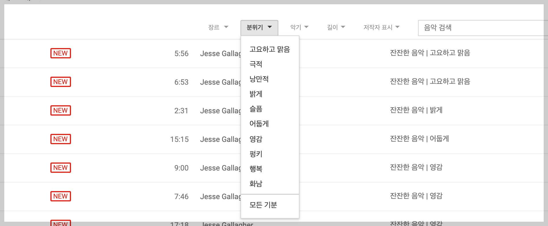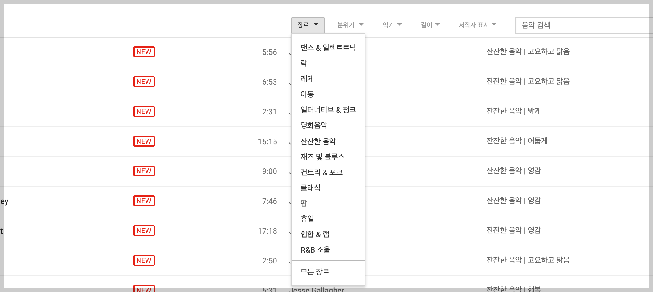 오디오 라이브러리에서 장르와 분위기를 선택할 수 있습니다.