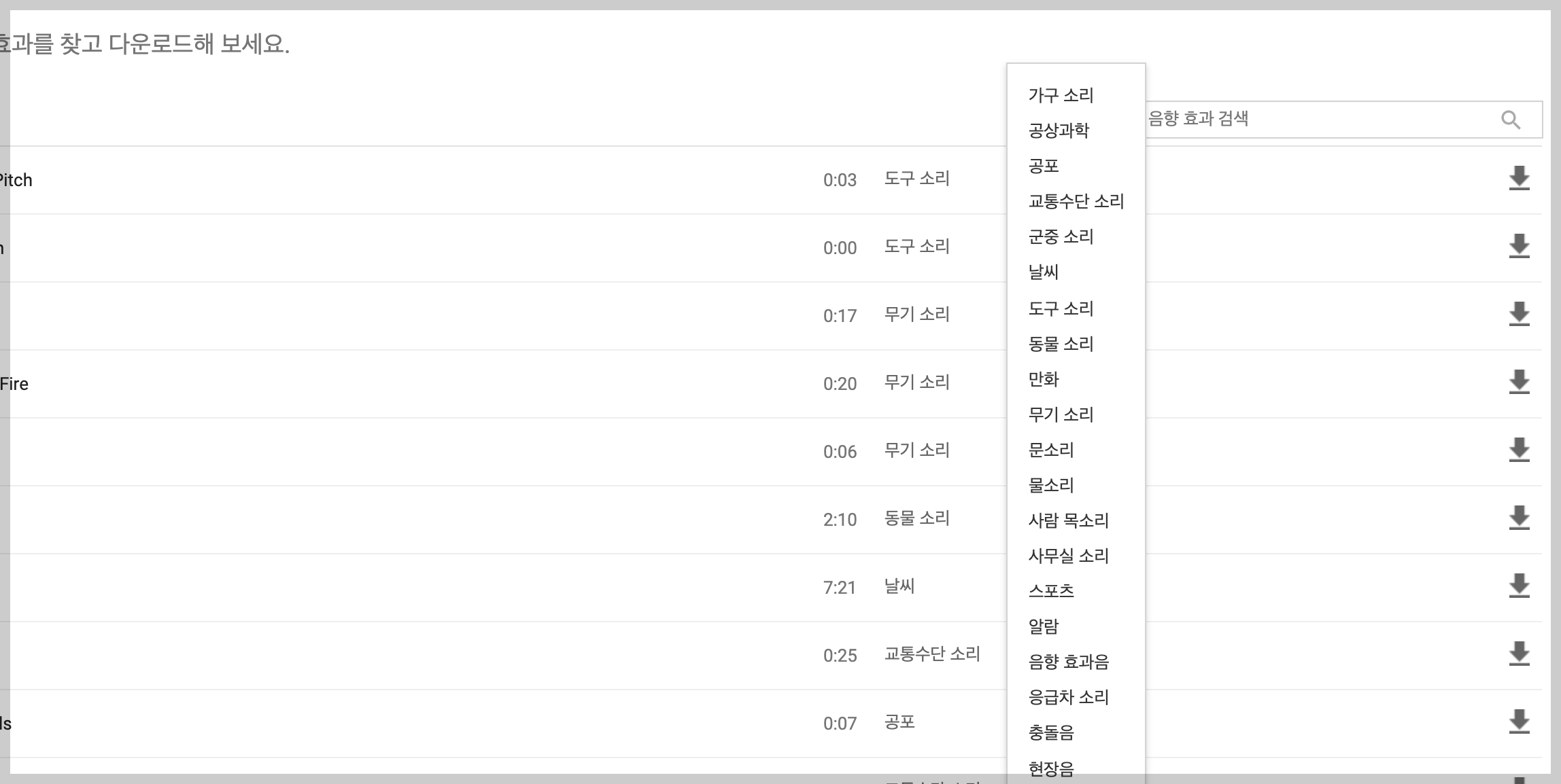 오디오 라이브러리에는 무료 음악도 있지만, 효과음 페이지도 있습니다. 음향 효과는 원하는 효과음을 검색 후 사용하면 편리합니다.