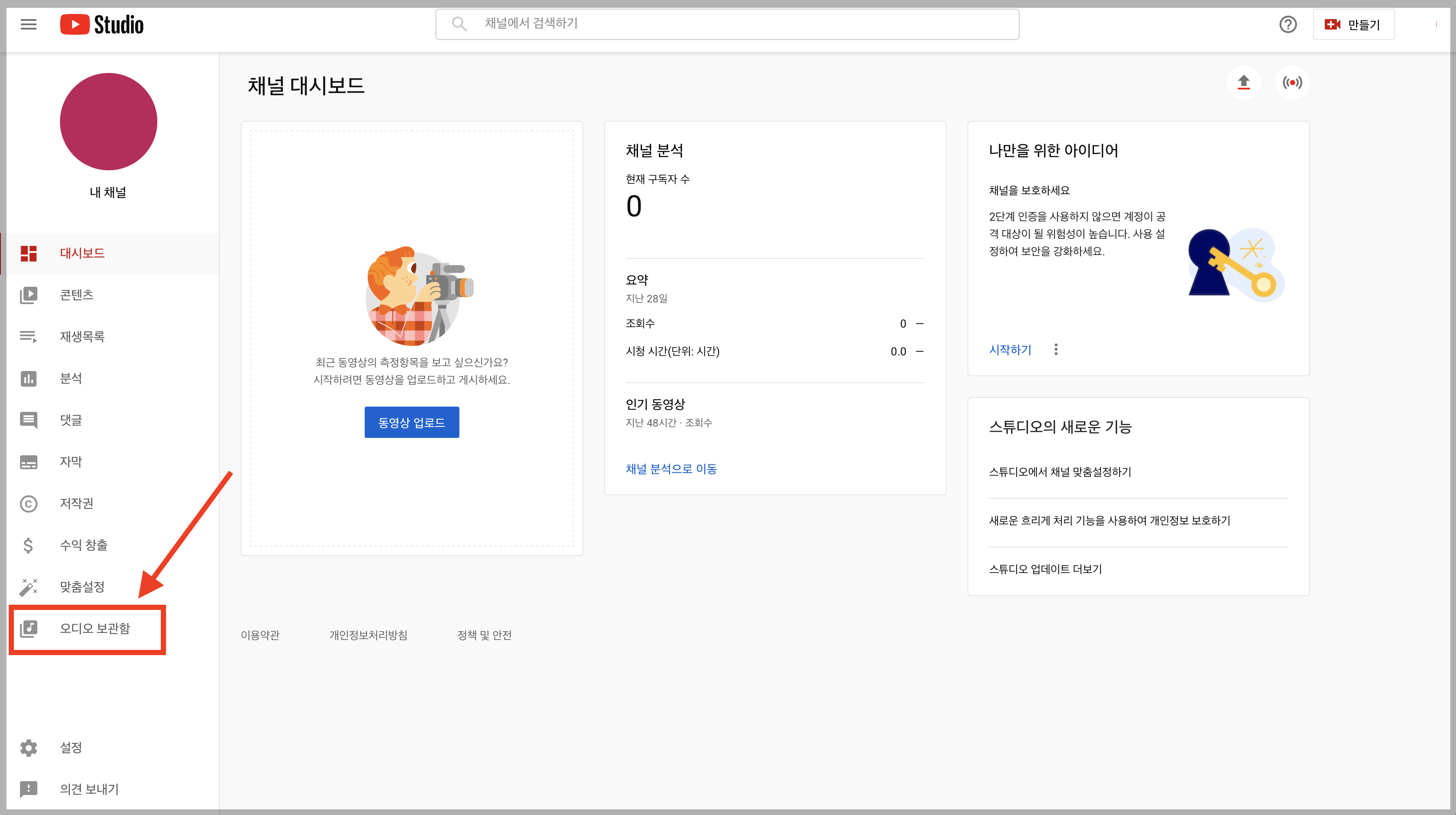 혹시 오디오 보관함 메뉴가 안보이는 분들은 스크롤을 아래로 더 내려보세요. 가장 밑에 나옵니다.