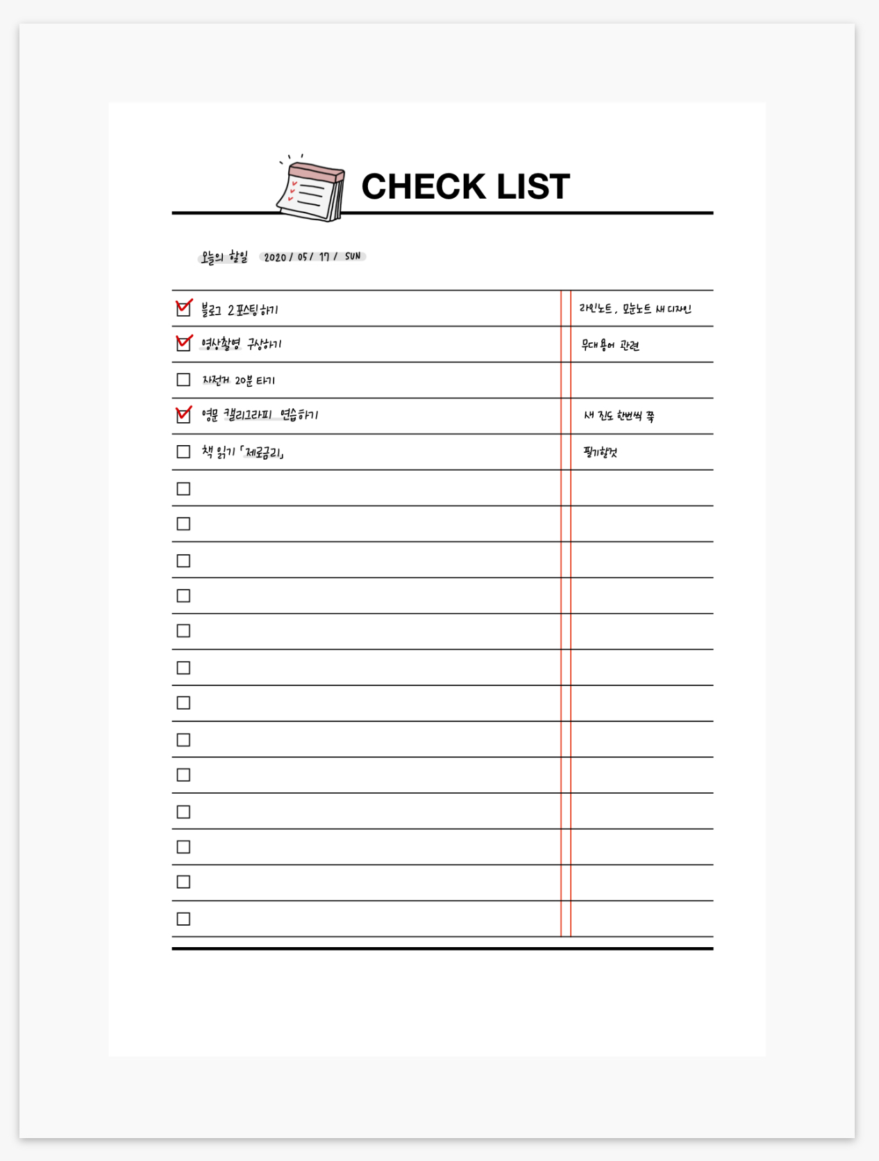 할일이 끝나면 왼쪽 체크박스에 체크를 해줍니다. 이 때 눈에 잘 띄는 색으로 해주는게 좋은 것 같아요. 빨간색 줄 옆에 비고란에는 좀더 상세한 내용을 적어놓기도 합니다.
