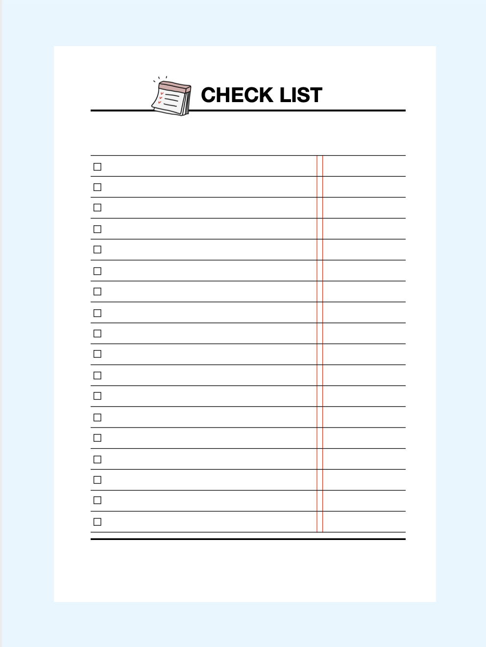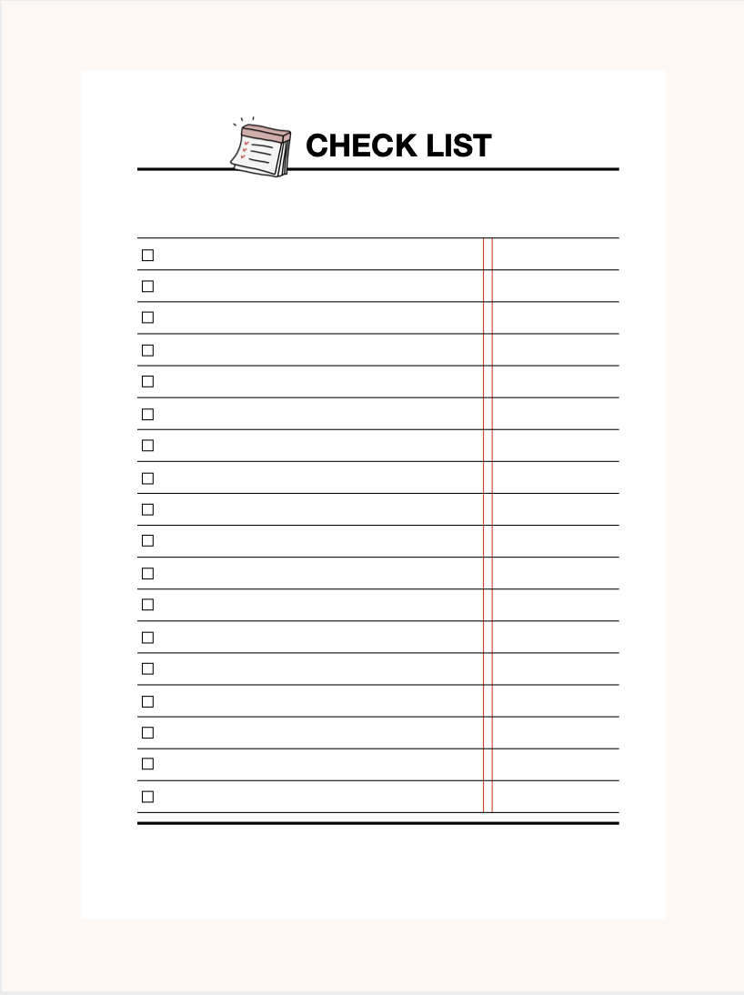 체크리스트는 다양하게 사용할 수 있습니다. 상단 빈칸에 주제를 적고 체크리스트를 작성해주세요. 저는 주로 하루에 해야할 일들을 적어놓습니다.