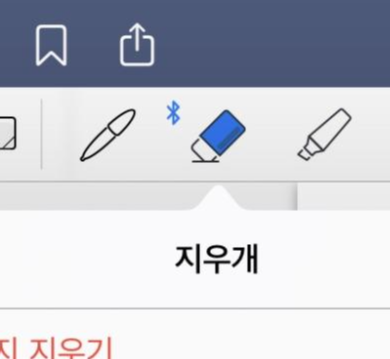 두번째로 가장 많이 사용하는 도구인 '지우개'입니다. 획 전체를 한꺼번에 지울 수도 있고, 원하는 부분만 지울 수도 있으며, 혹은 하이라이터만 지울 수 있도록 설정할 수 있습니다. 페이지 전체를 지울 수도 있습니다. 지우개의 크기도 3가지로 변경 가능합니다.