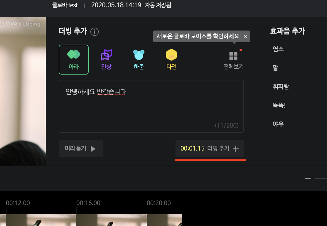 클로바를 사용하기 전에 당연히 기계음과 비슷할 줄 알았는데, 사용 해분 뒤 억양까지 사람과 비슷해서 놀랐어요. 더빙 프로그램이 밝고 어두운 목소리까지 나타낼 수 있다니 정말 신기했습니다.