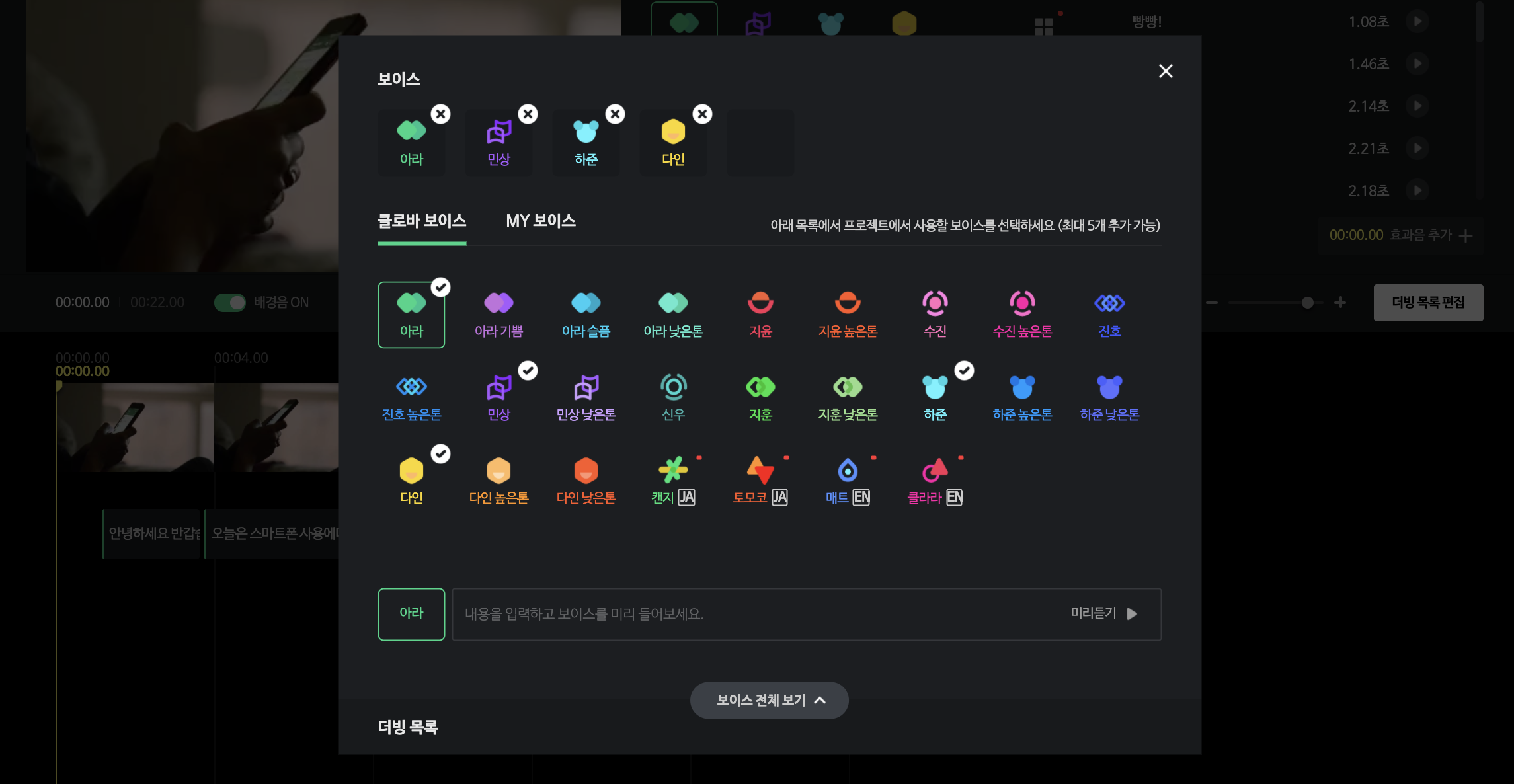 기본적으로 아라, 민상, 하준, 다인 네 목소리가 있고, 옆에 [전체보기]를 누르면 더 많은 목소리를 들어볼 수 있습니다. (영어, 일본어 더빙도 있습니다)