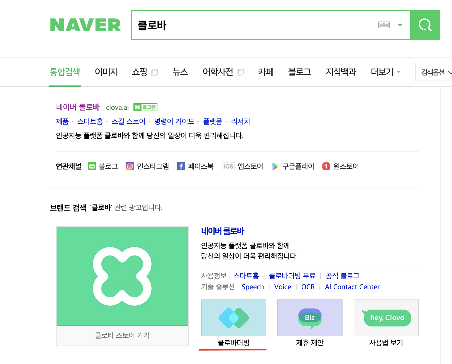 네이버에서 '클로바'라고 검색을 하면 아래와 같은 화면이 나옵니다. 여기서 [클로바 더빙]을 눌러주세요.