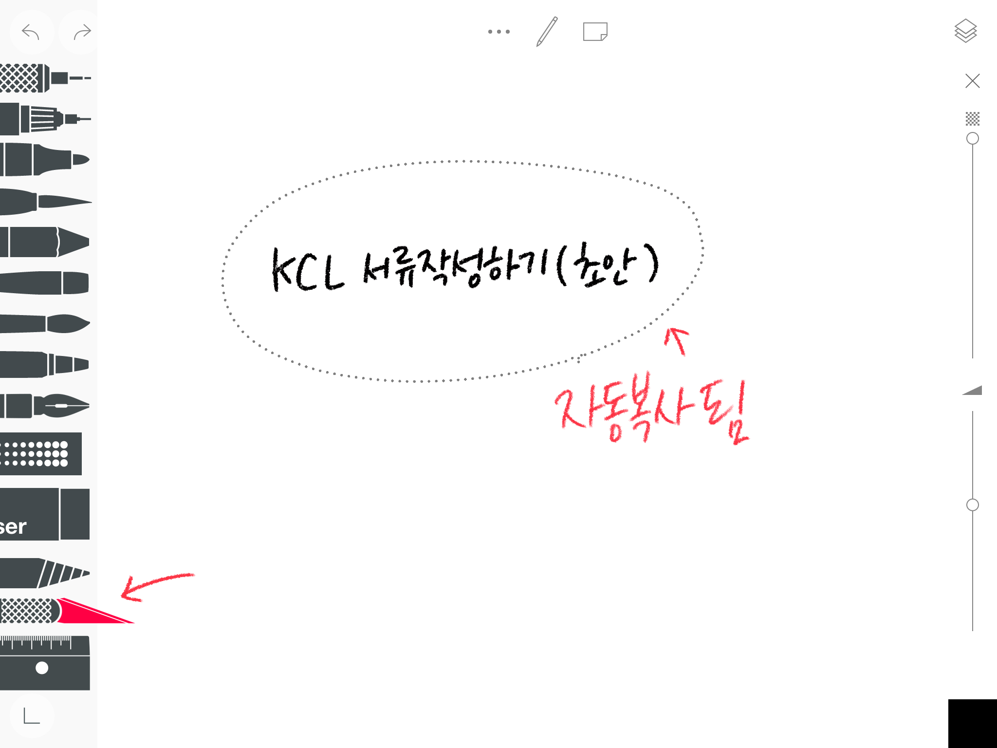 저는 다섯 번째에 위치해 있는 [오일파스텔]로 글씨를 적습니다. 그리고 아래 [칼 툴]로 글씨를 선택해줍니다. 자동으로 복사가 됩니다. (간단. 끝)